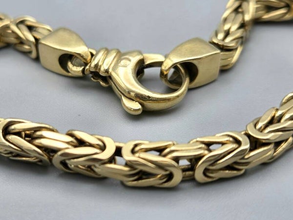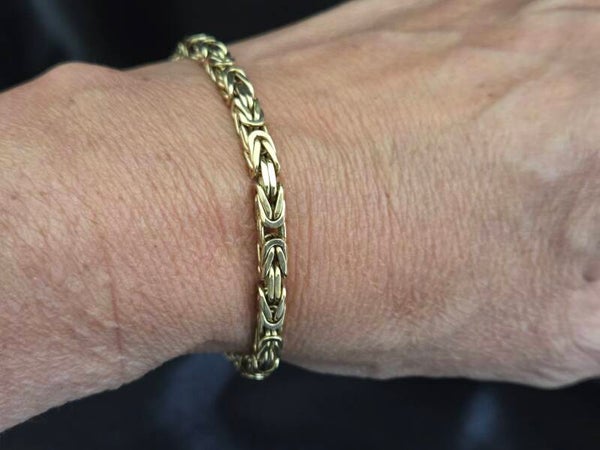 In zeer goede staat 18 karaat massief geelgouden koningsarmband (byzantijns), voorzien van eindstukken en grove karabijnhaak. Door het brede model van deze gouden armband, valt hij prachtig op. De koningsschakel is er eentje die stevig en zeer gedetailleerd is. Met zijn robuuste uitstraling is deze armband een echte eyecatcher.