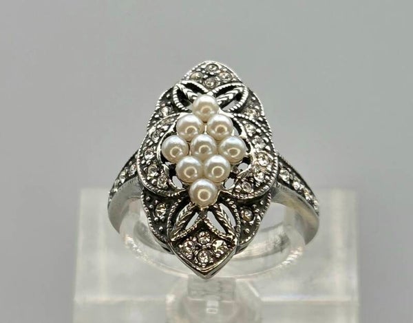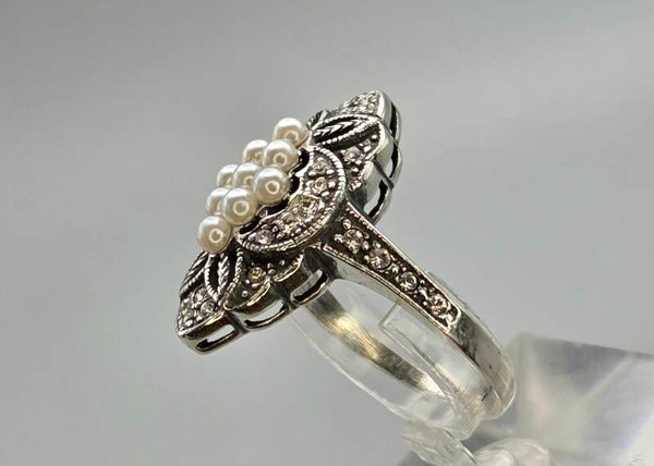 Zilveren Art Deco ring met Parel en Swarovski Kristallen. 2025/561.
