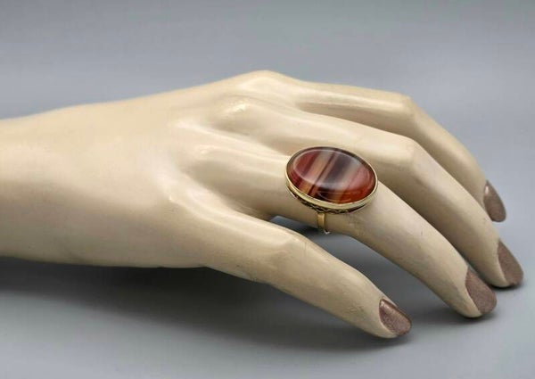 De warme kleur van deze vintage gouden ring past overal bij. Juist dat is zo leuk aan vintage sieraden met streepagaat. Deze gouden ring is gemaakt van 14 karaat goud en heeft die mooie bewerking die zo kenmerkend is aan vintage gouden ringen.