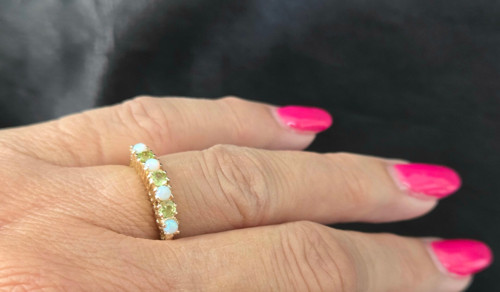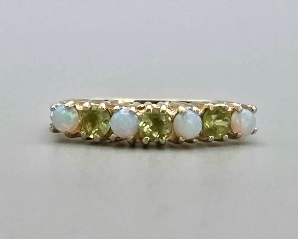 Deze prachtige vintage ring is gemaakt van 9 karaat. De ring is gezet met edelsteen peridot en prachtige edelsteen opaal. De opaal is cabochon geslepen. De edelstenen peridot zijn briljant geslepen.