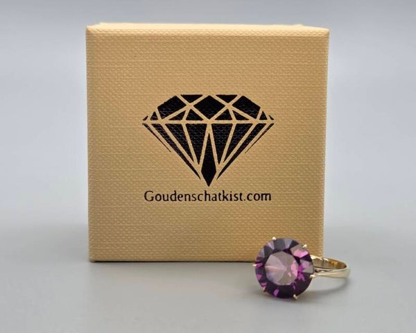 Deze vintage design ring is een echte statement ring. Hij is gemaakt van 9 karaat, met in het middelpunt prachtige mooie edelsteen paarse saffier die alle aandacht trekt.