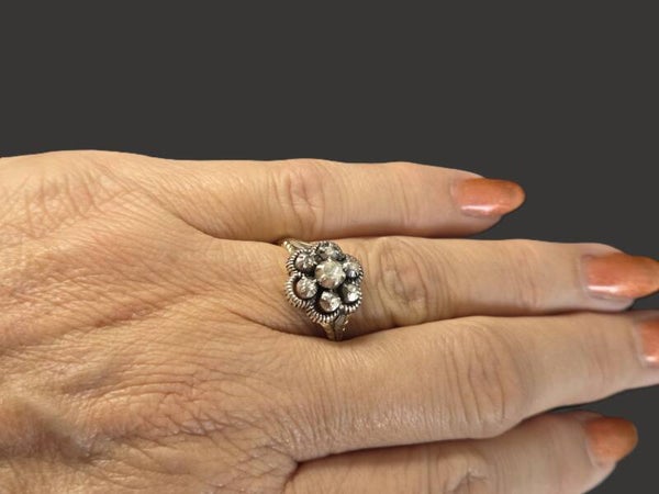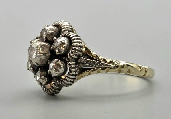 Deze gouden antieke dames ring is bijzonder uniek door zijn aparte ontwerp. De ring is gemaakt van 14 karaat goud. De band is gemaakt van geelgoud en de zetting, waarin de diamanten zijn gezet, van zilver. De diamanten zijn roos geslepen en hebben samen een gewicht van 0.25 ct.