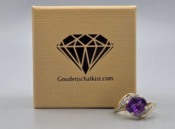 Deze prachtige vintage ring is gemaakt van 9 karaat. De ring is gezet met diamanten en prachtige paarse edelsteen amethist. De amethist is facet geslepen. De diamanten zijn briljant geslepen.