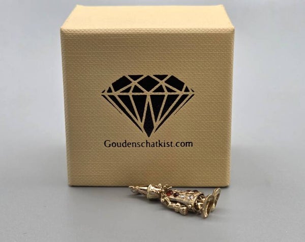Gouden clown hanger. De hanger is gedetailleerd en gezet met granaat en witte toermalijn. De armen en benen en het hoofd van de clown zijn beweegbaar. Deze unieke hanger is vervaardigd uit 14 karaat geelgoud.