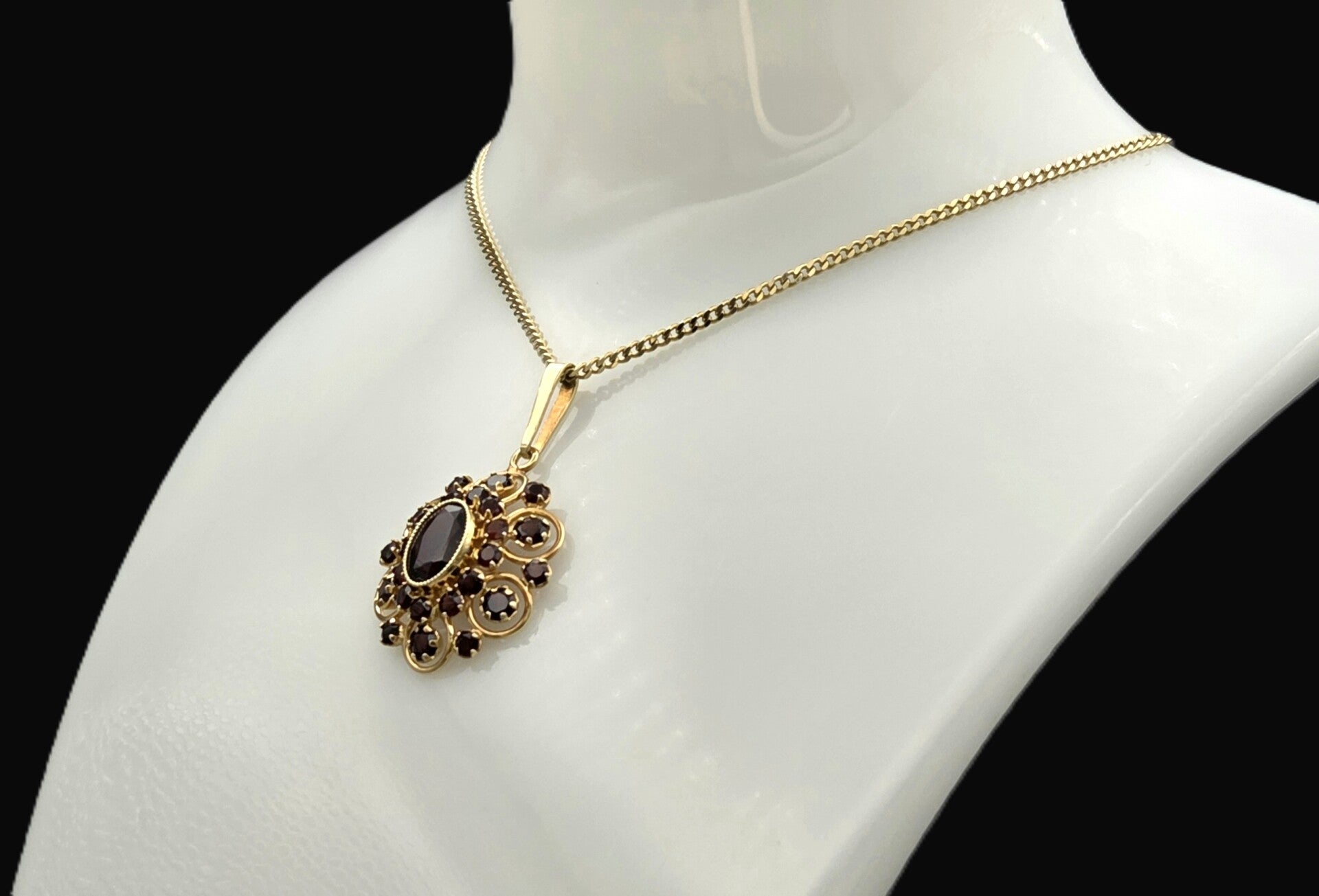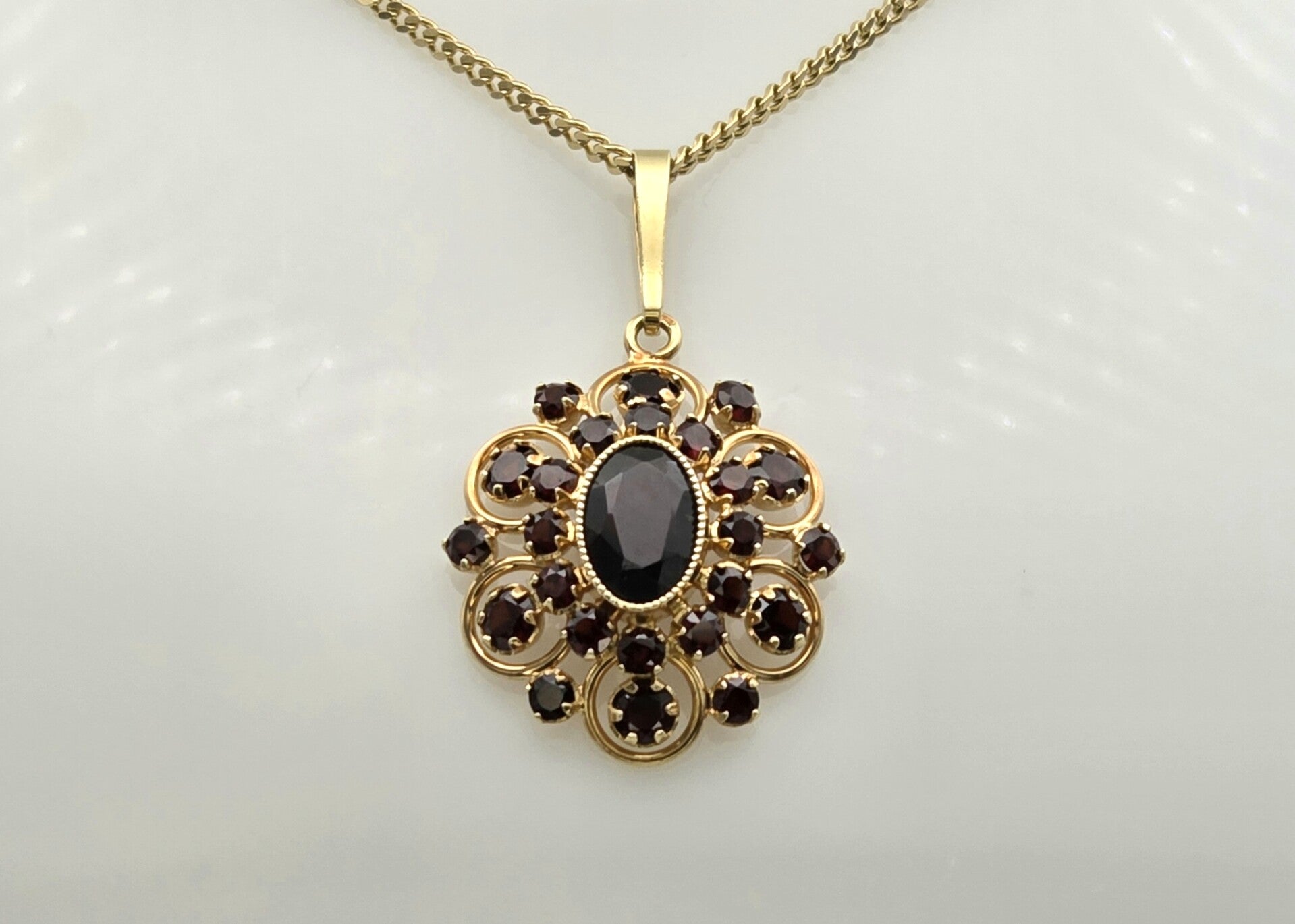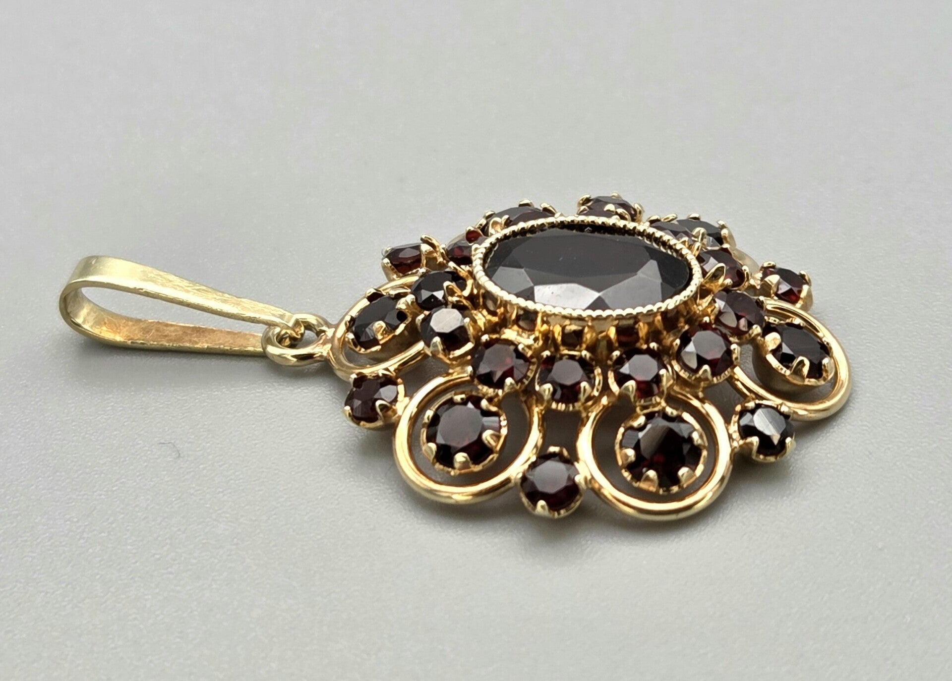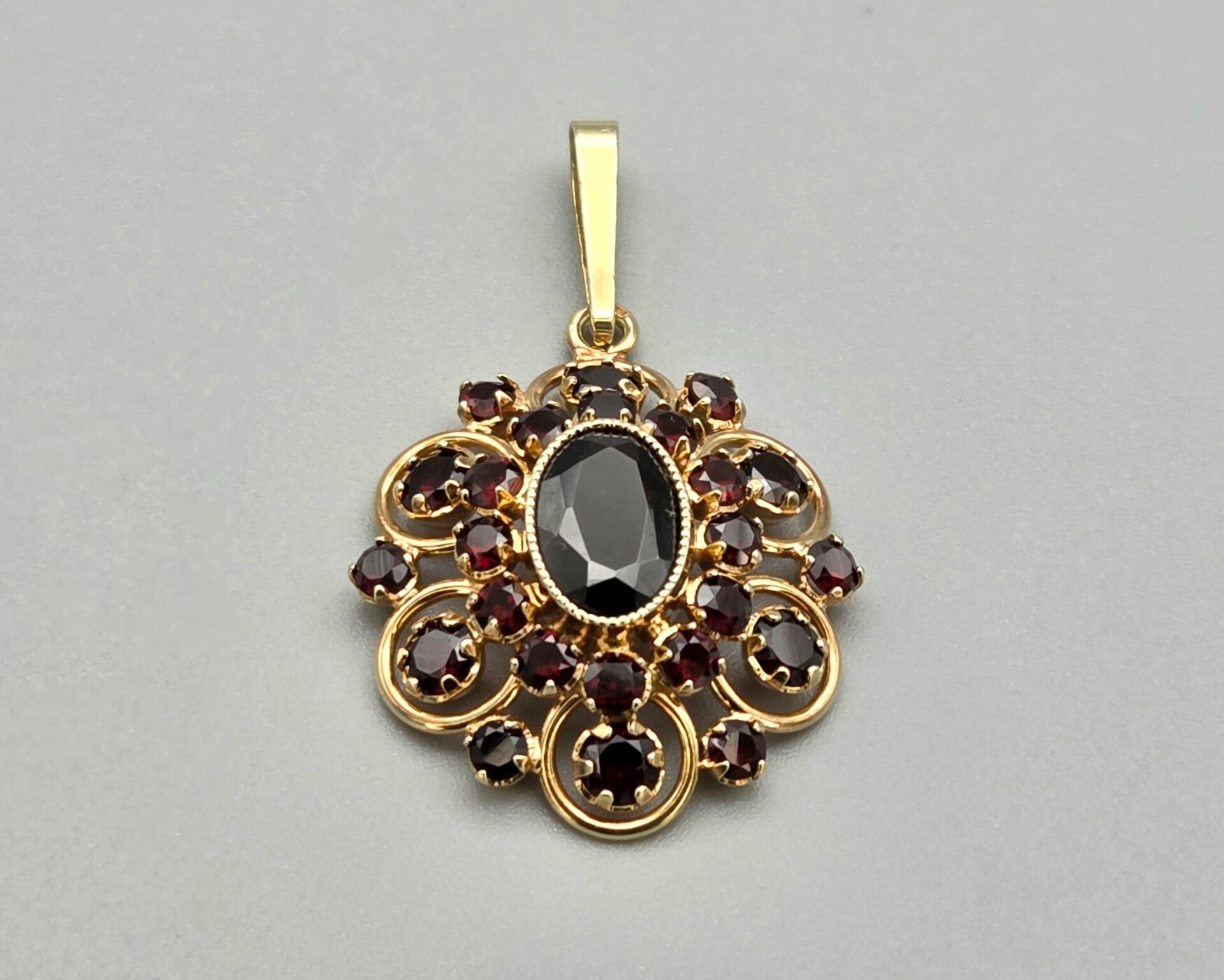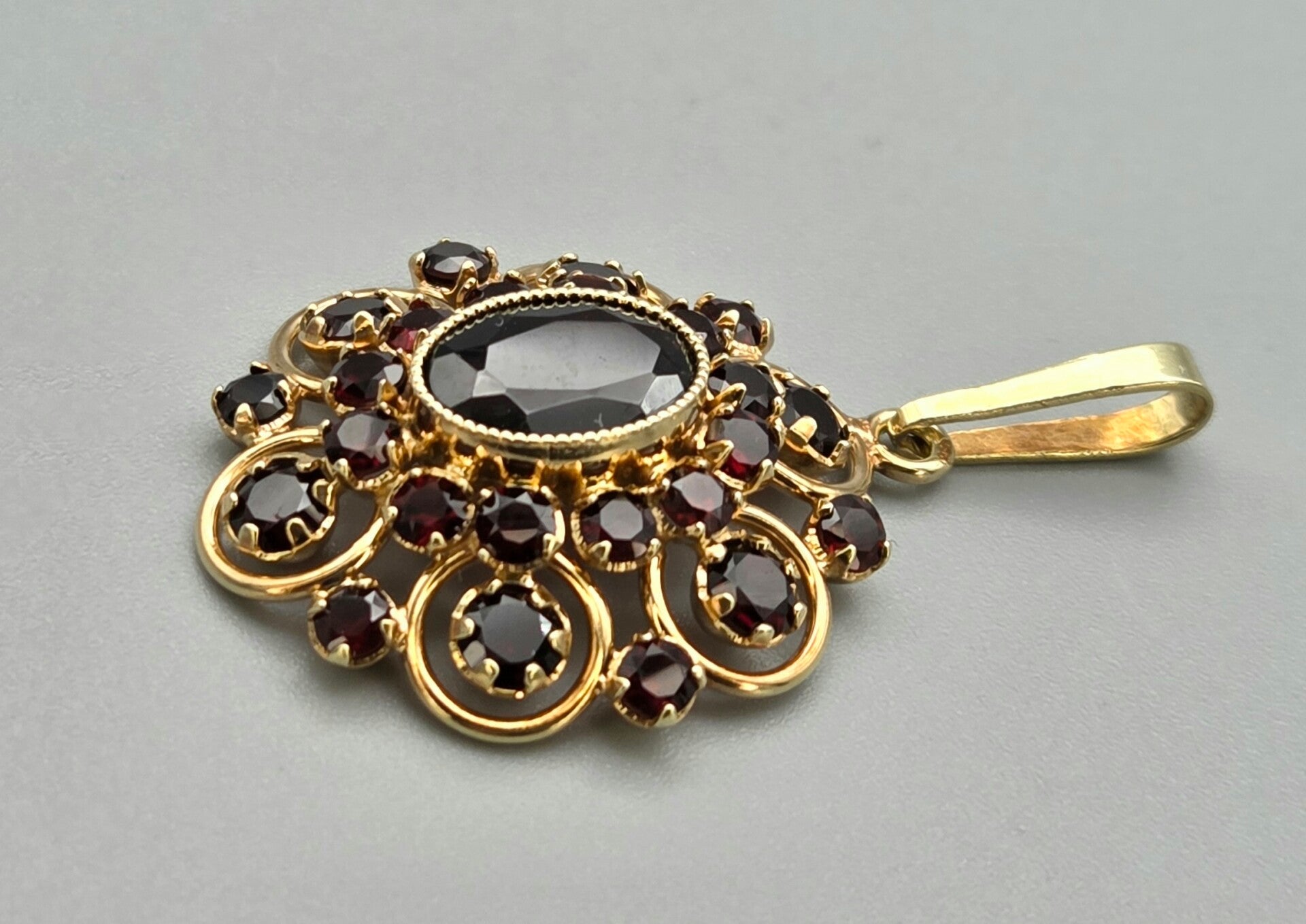 Deze prachtiege mooie antieke gouden hanger is een prachtige eyecatcher. Dat komt door die mooie rode granaat edelstenen. De hanger is gemaakt van 14 karaat geelgoud en is ovaal van vorm.