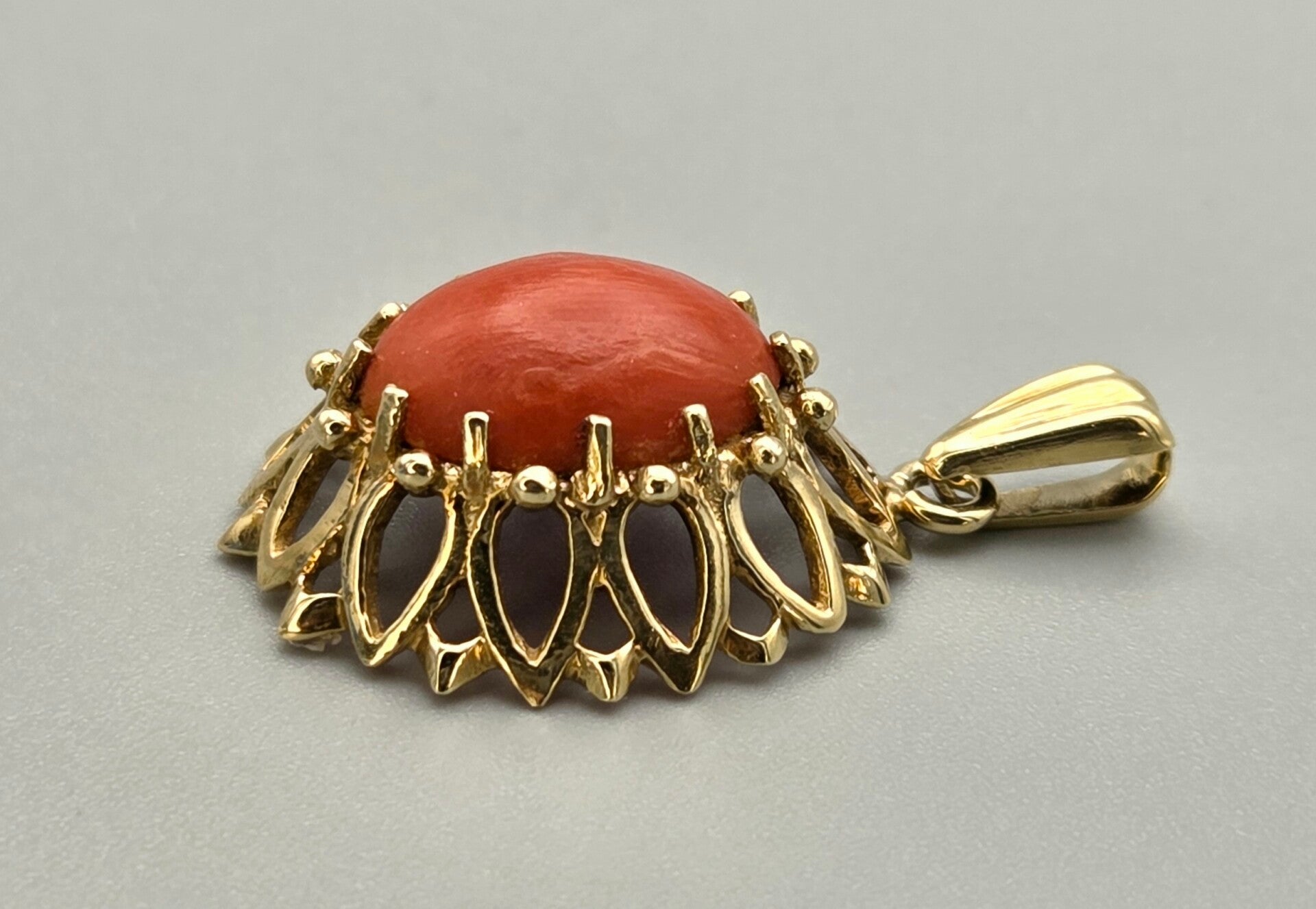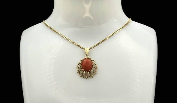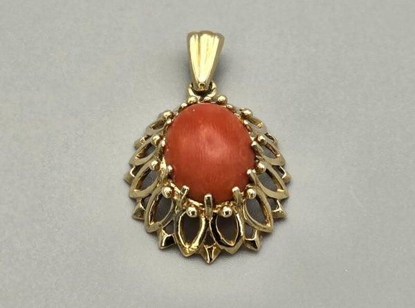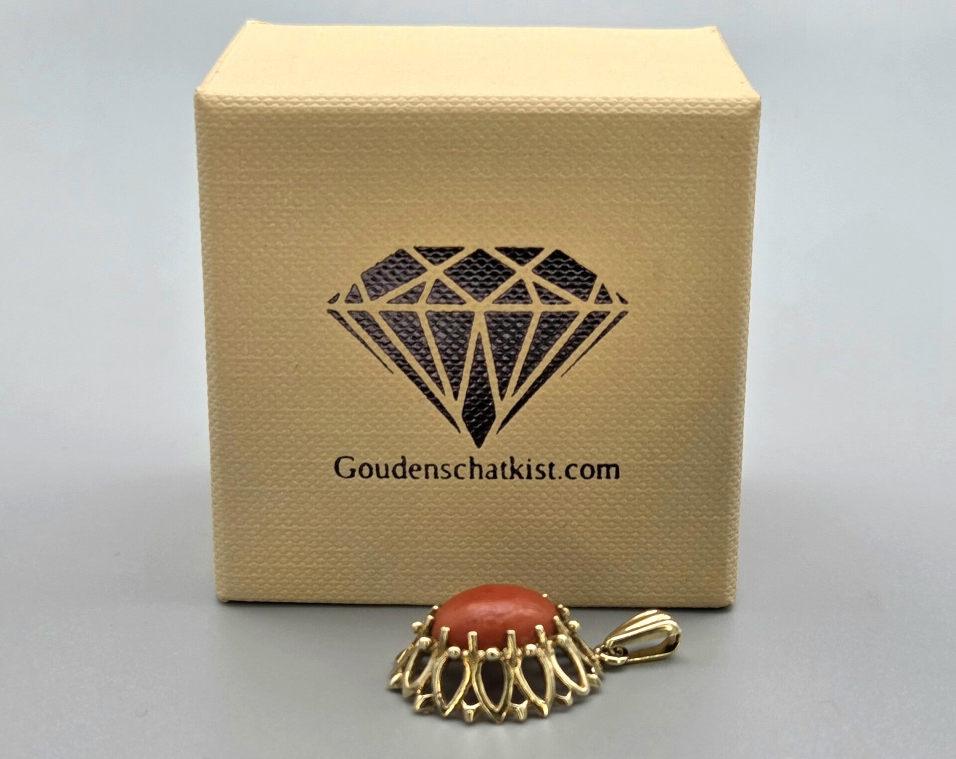 Deze hanger heeft een prachtige en sierlijke bewerking van goud rondom de bloedkoraal. Door het subtiele formaat is dit een perfecte hanger voor dagelijks gebruik.