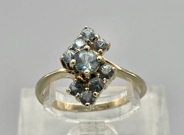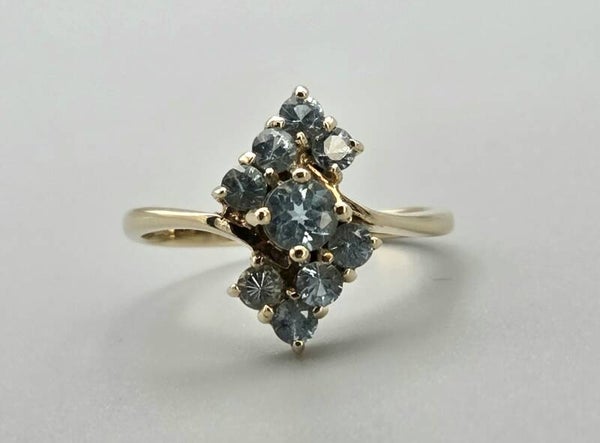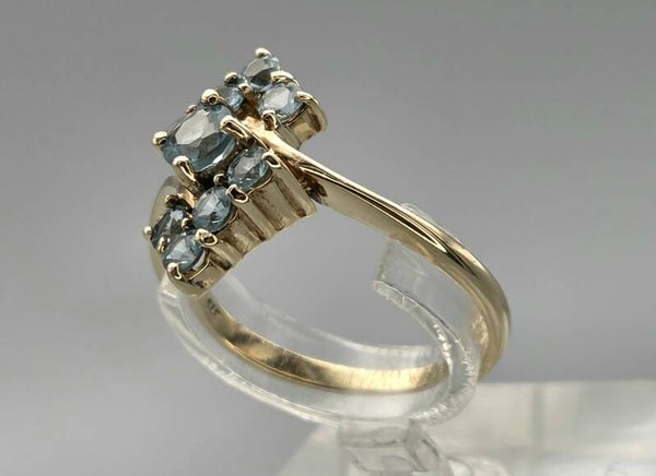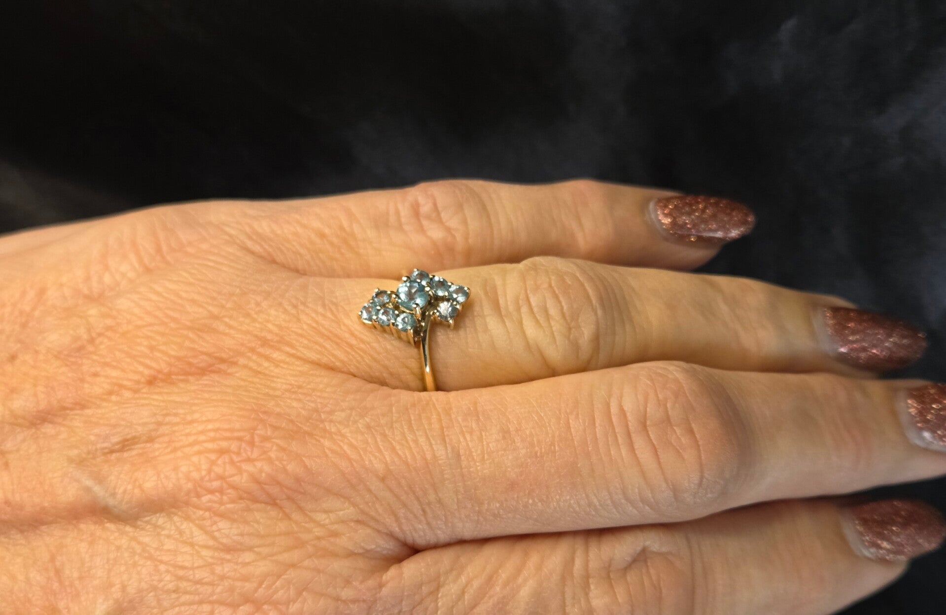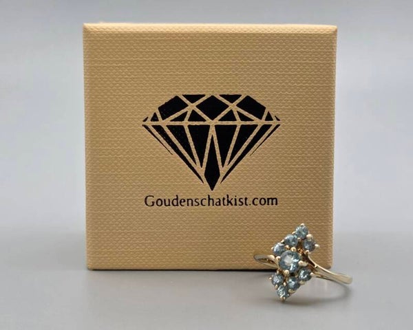 Deze vintage design ring is een echte statement ring. Hij is gemaakt van 9 karaat, met in het middelpunt prachtige mooie edelstenen aquamarijn die alle aandacht trekt.