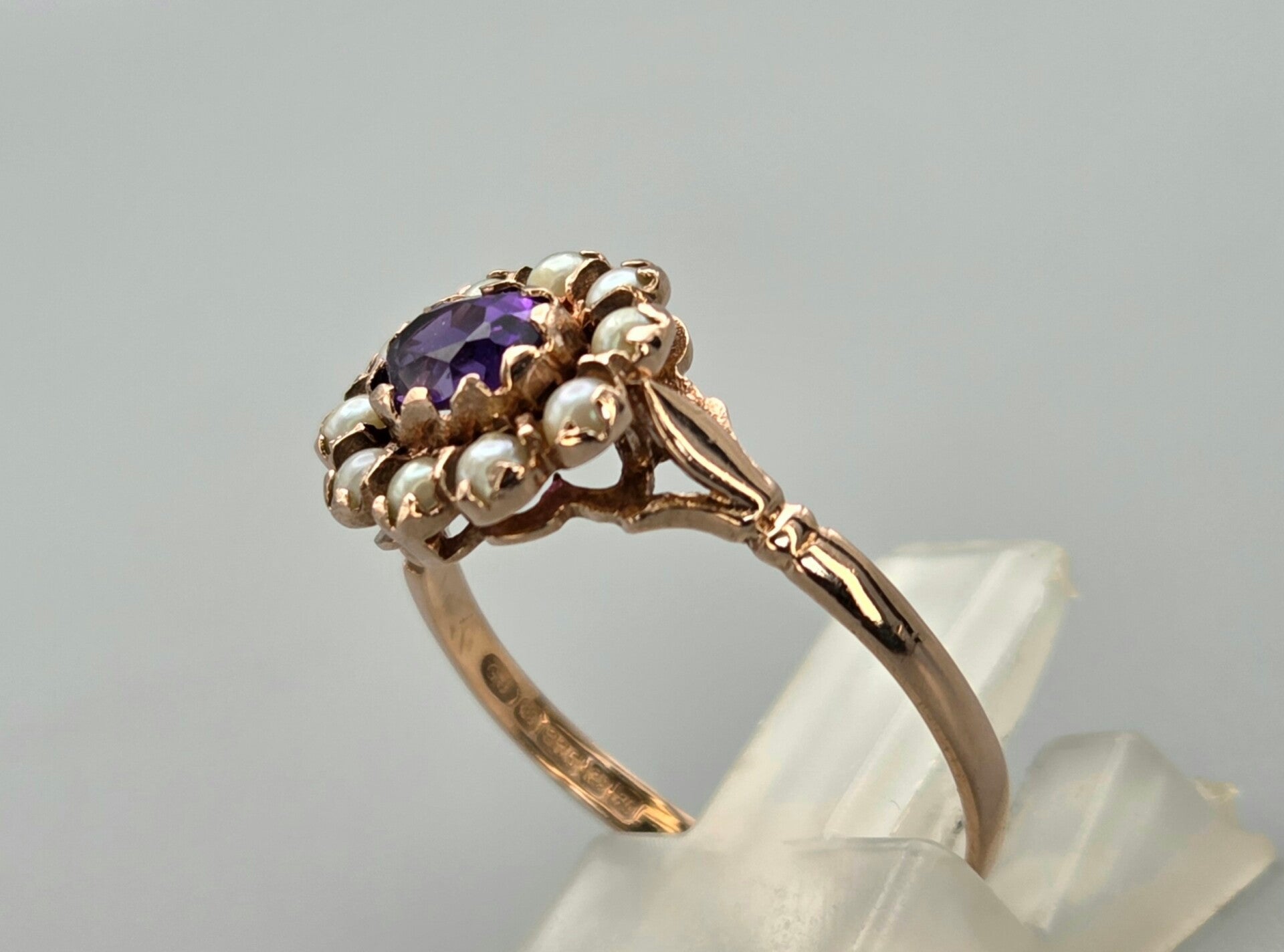 Hier komt geschiedenis tot leven. Deze buitengewoon prachtige ring is gemaakt van 9karaat . De voorkant is gevormd als een bloem, die is gezet met glinsterende parels en een amethist edelsteen.