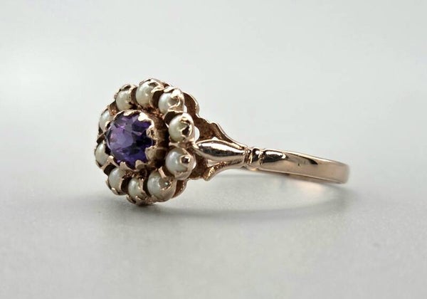 Vintage ring met edelsteen amethist en zaadparel. 2025/857.