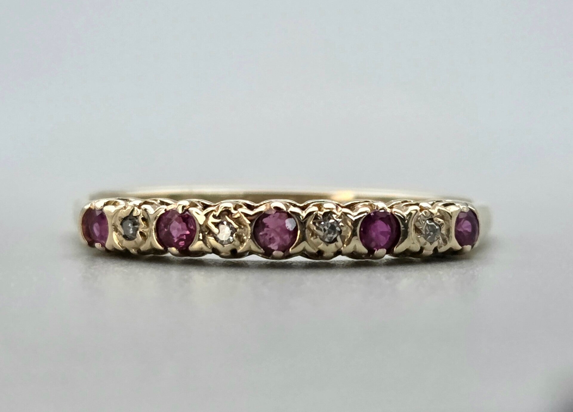 Een mooie vintage aanschuifring die van je vinger spat! Deze vintage ring is gemaakt van 9 karaat en is gezet met edelsteen robijnen en diamanten. De diamanten hebben een gewicht van 0.04 ct. Wie gaat deze vintage eyecatcher dragen.