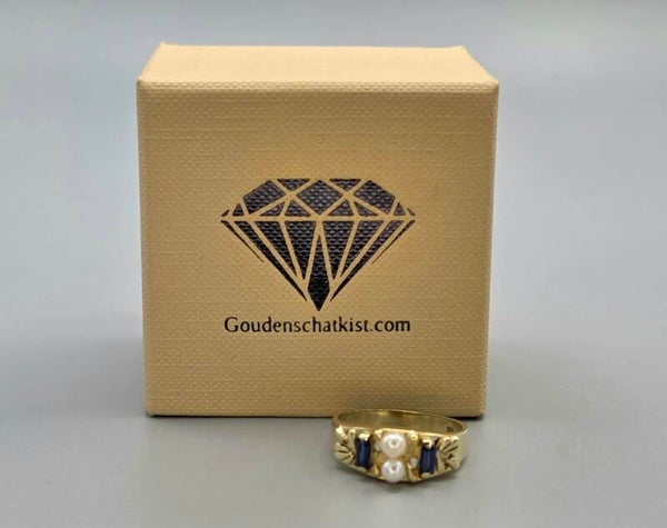 Vintage design ring met edelsteen saffier en parel. 2026/144.