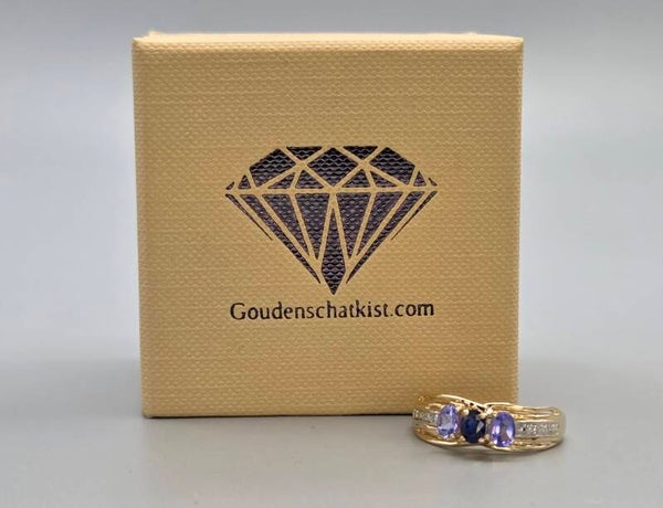 Deze mooie prachtige vintage ring is gemaakt van 14 karaat geel goud. De ring is gezet met diamanten en prachtige tanzaniet en saffier edelstenen. De tanzaniet en saffier zijn facet geslepen en vallen mooi op. De diamanten zijn briljant geslepen. Deze ring is ook uitstekend geschikt als verlovingsring.