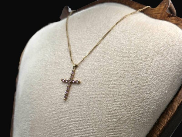 Deze vintage tijdloze 9 karaat kruisje met roze saffier straalt pure elegantie en subtiliteit uit. De roze saffieren vormt het middelpunt van het ontwerp. Dit zorgt voor een mooie balans tussen kleur en schittering.