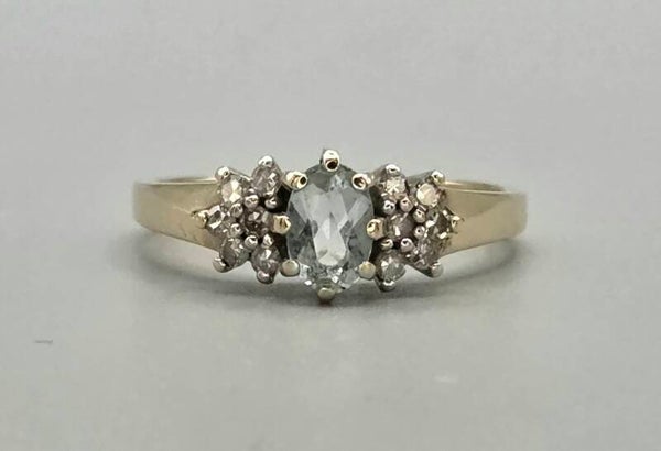 Deze vintage dames ring is gemaakt van 9 karaat. De ring is gezet met een natuurlijke aquamarijn edelstenen en briljant geslepen diamanten. Deze hebben samen een gewicht van 0.10 ct.