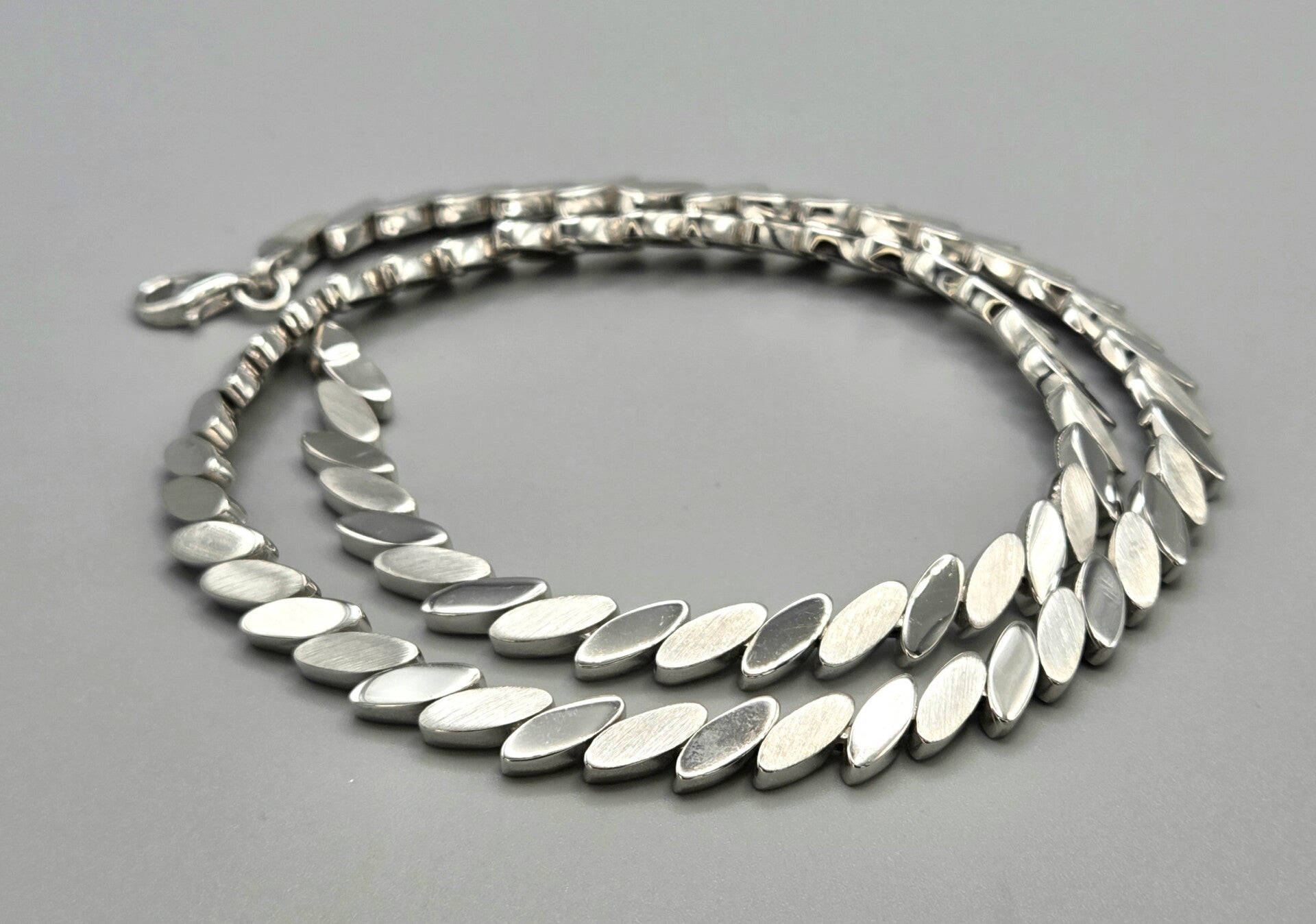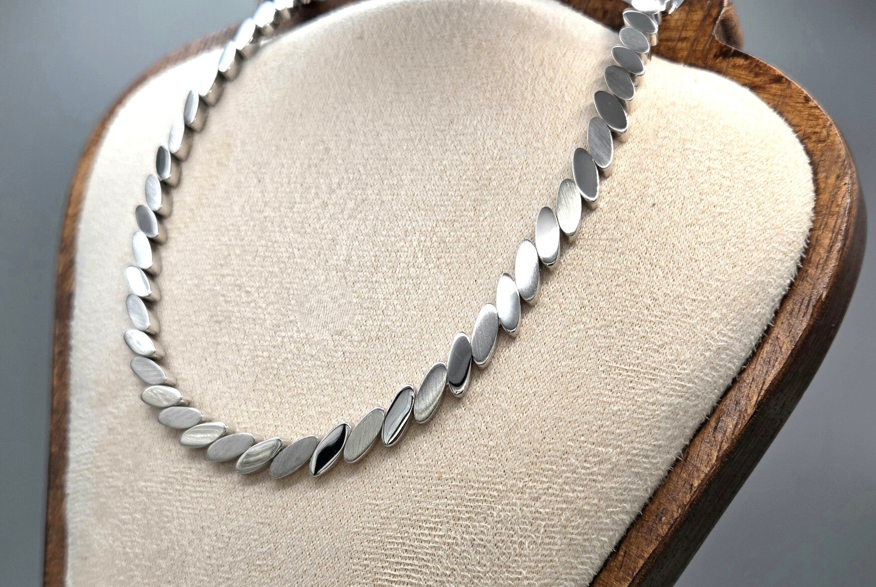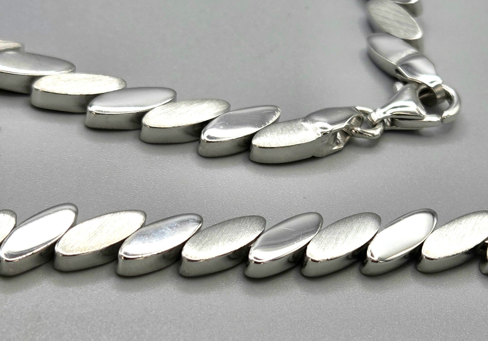 Wat een prachtige stijlvolle vintage zilveren ketting! De schakels zijn mat en glanzend geslepen en hierdoor schitterd de ketting prachtig. De ketting is gemaakt van 925 zilver. 30 jaar bij een groothandel in het magazijn gelegen.