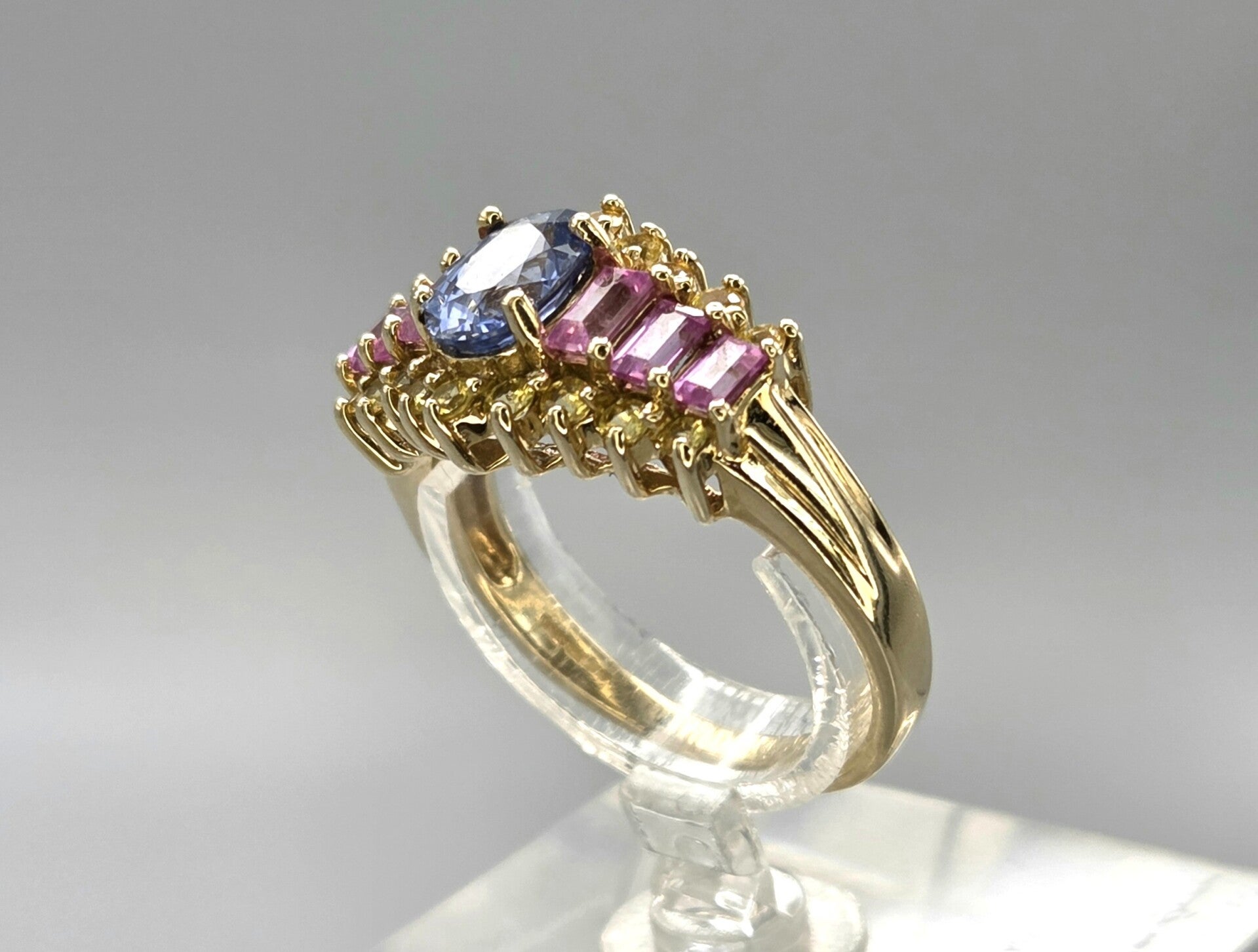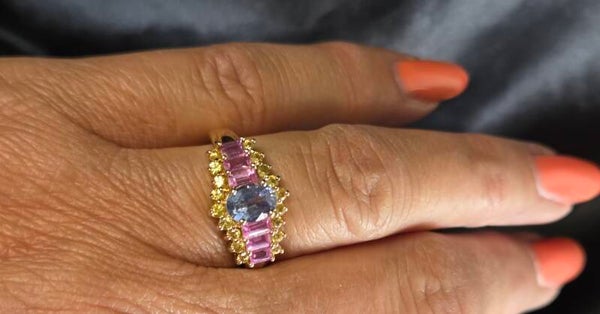 Deze 9 karaat vintage ring met saffieren is allesbehalve standaard. Het bijzondere ontwerp combineert warme geelgouden lijnen met een rijke zetting van fonkelende paarse,gele en blauwe saffieren. De speelse vorm geeft de ring een luxe vintage uitstraling en maakt dit een echte eyecatcher aan de hand.