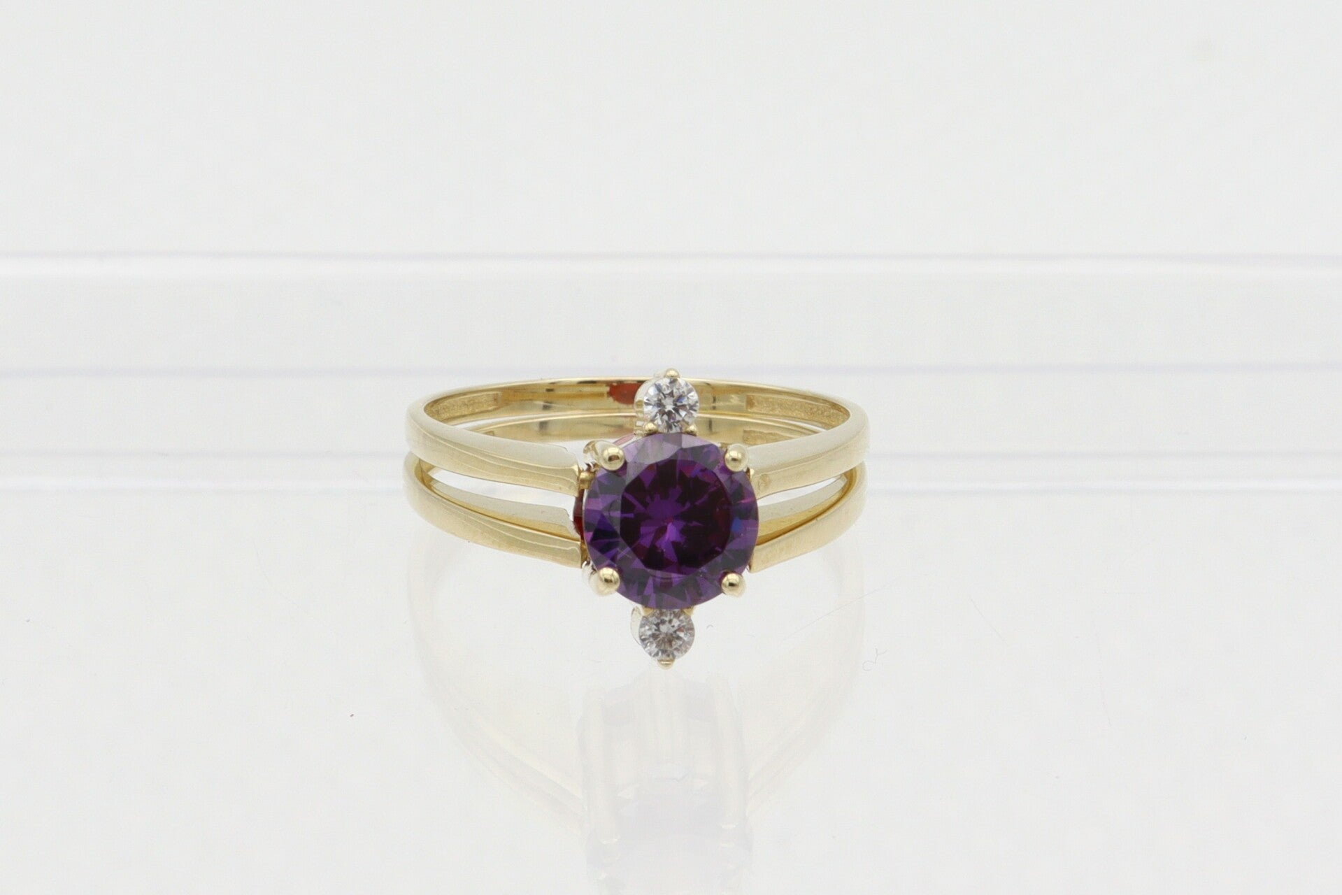 Gouden vintage vouw ring met amethist en rode saffier. Maat: 18.3. 2020/835.
