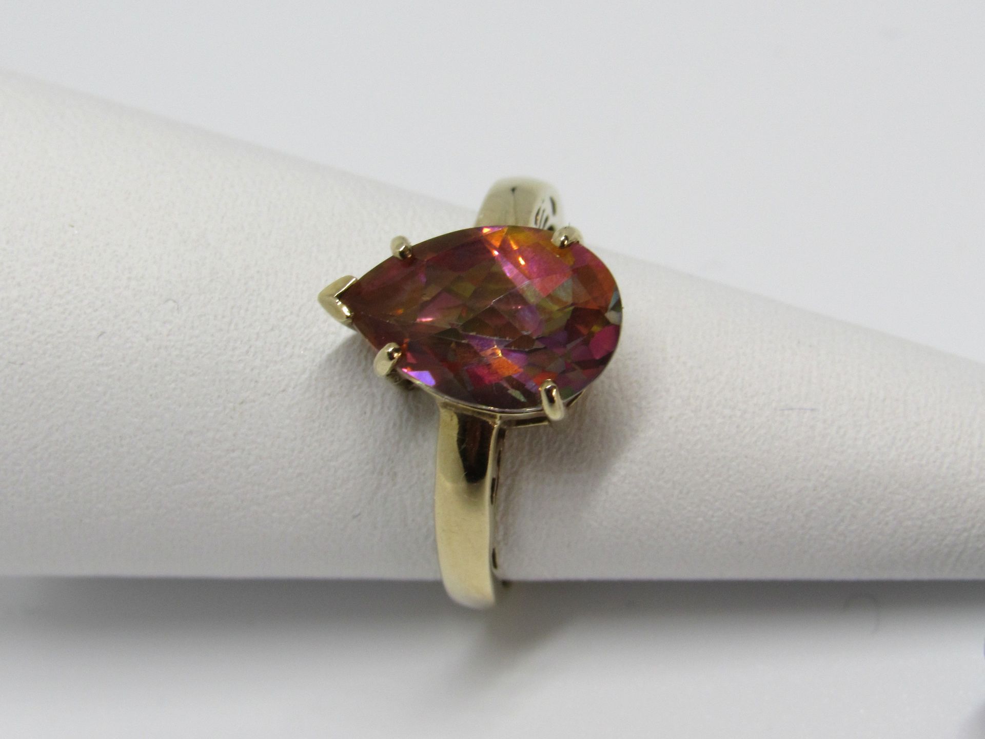 Met certificaat. Maat: 17. Kop: 13 mm x 8 mm. Mystic Topaas: 12 mm x 8 mm.. Slijpvorm: Peer. Kleur Goud: Geel. Gemerkt : 375.(b.w.g.g.) Conditie: Uitstekend. (typefouten voorbehouden)