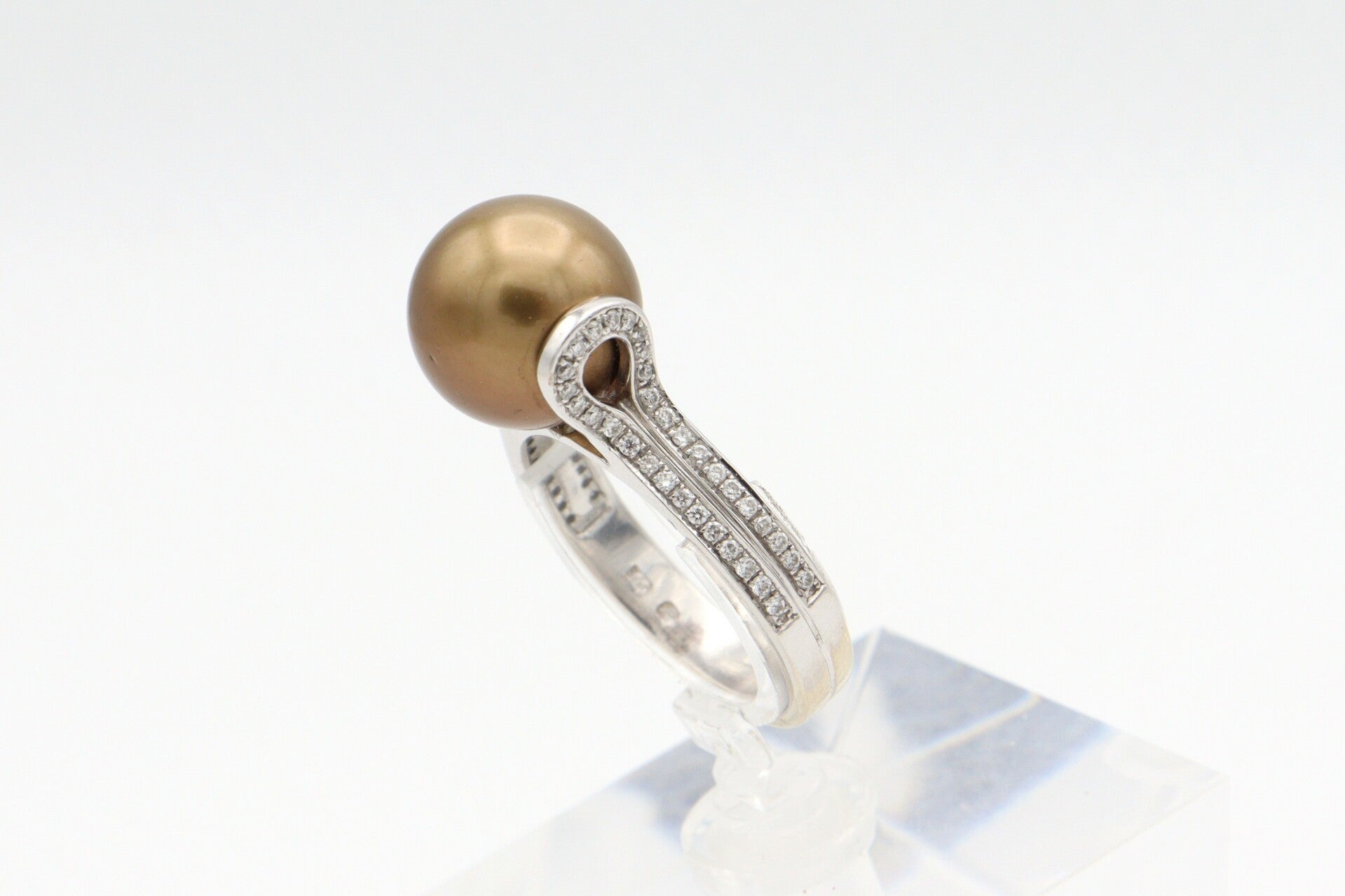 18 Karaat. Gouden vintage ring met bronzen parel en 66x diamanten: Ca: 0.55 ct.. Maat: 17.6. Nr: 2021/119.