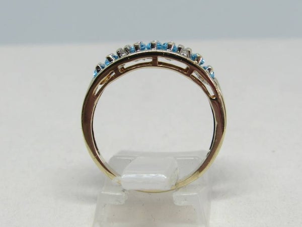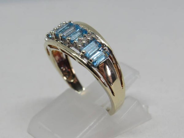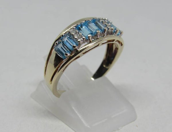 9 Karaat. Ring met 7x blauwe topaas en 6x diamant. Maat: 17.1. Nr: 19/A195.