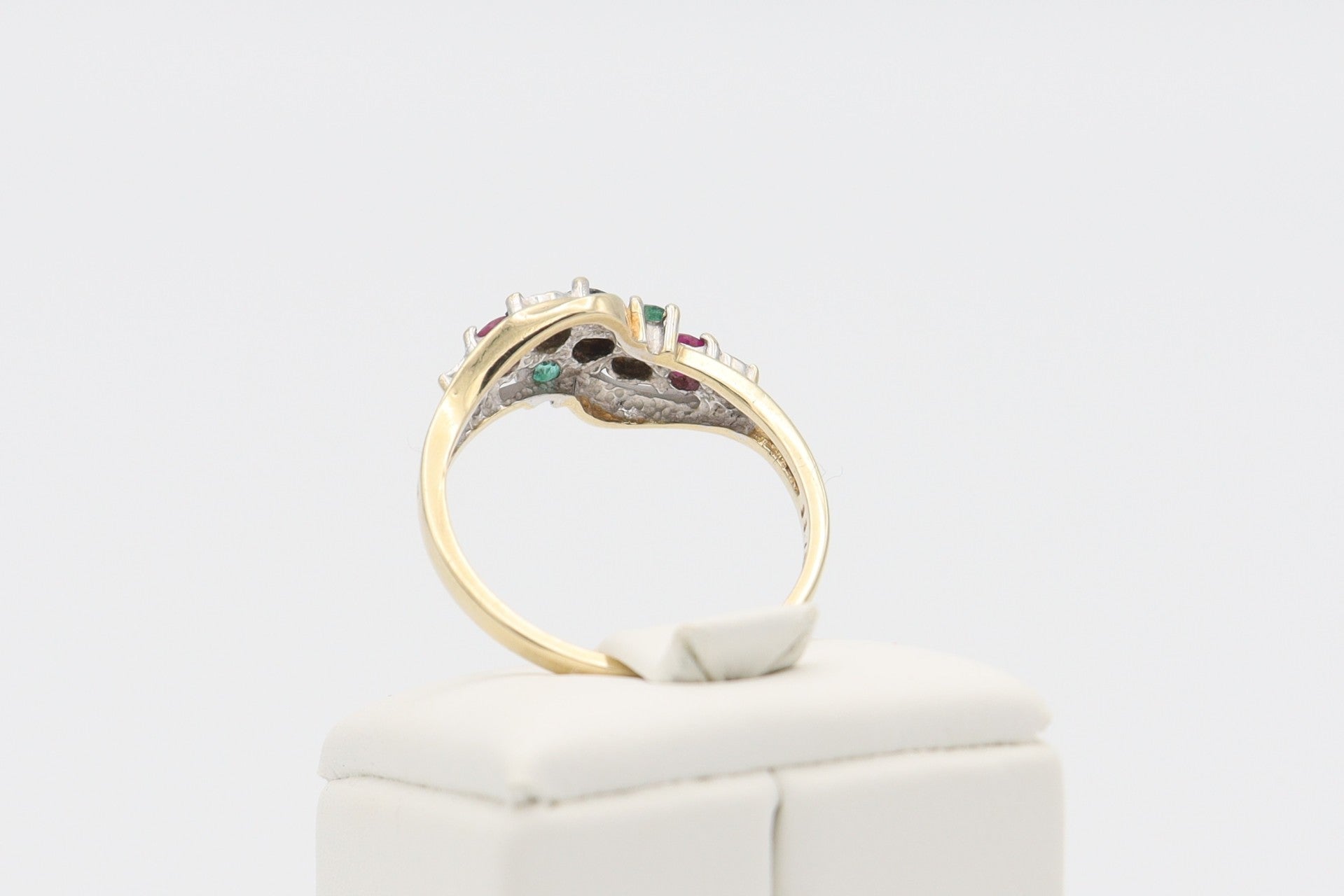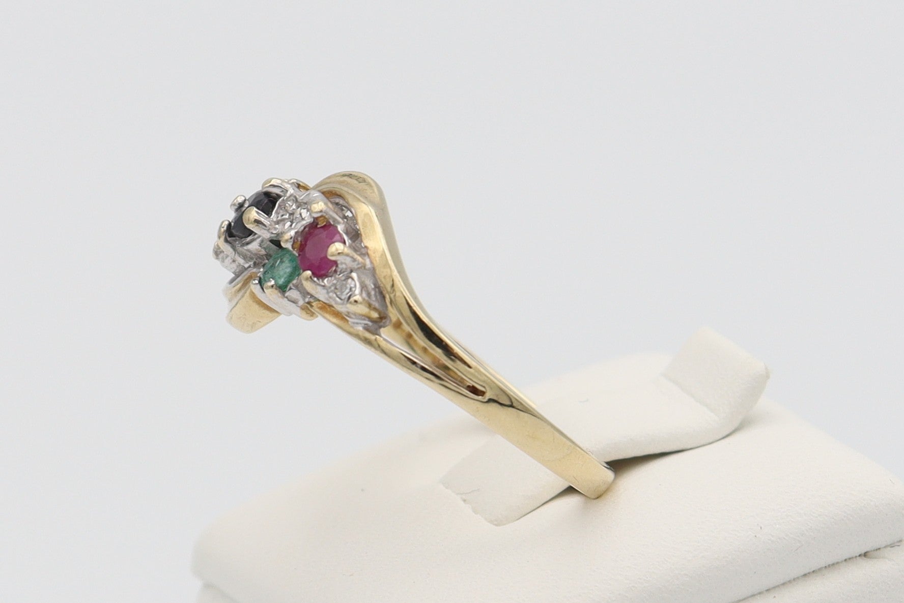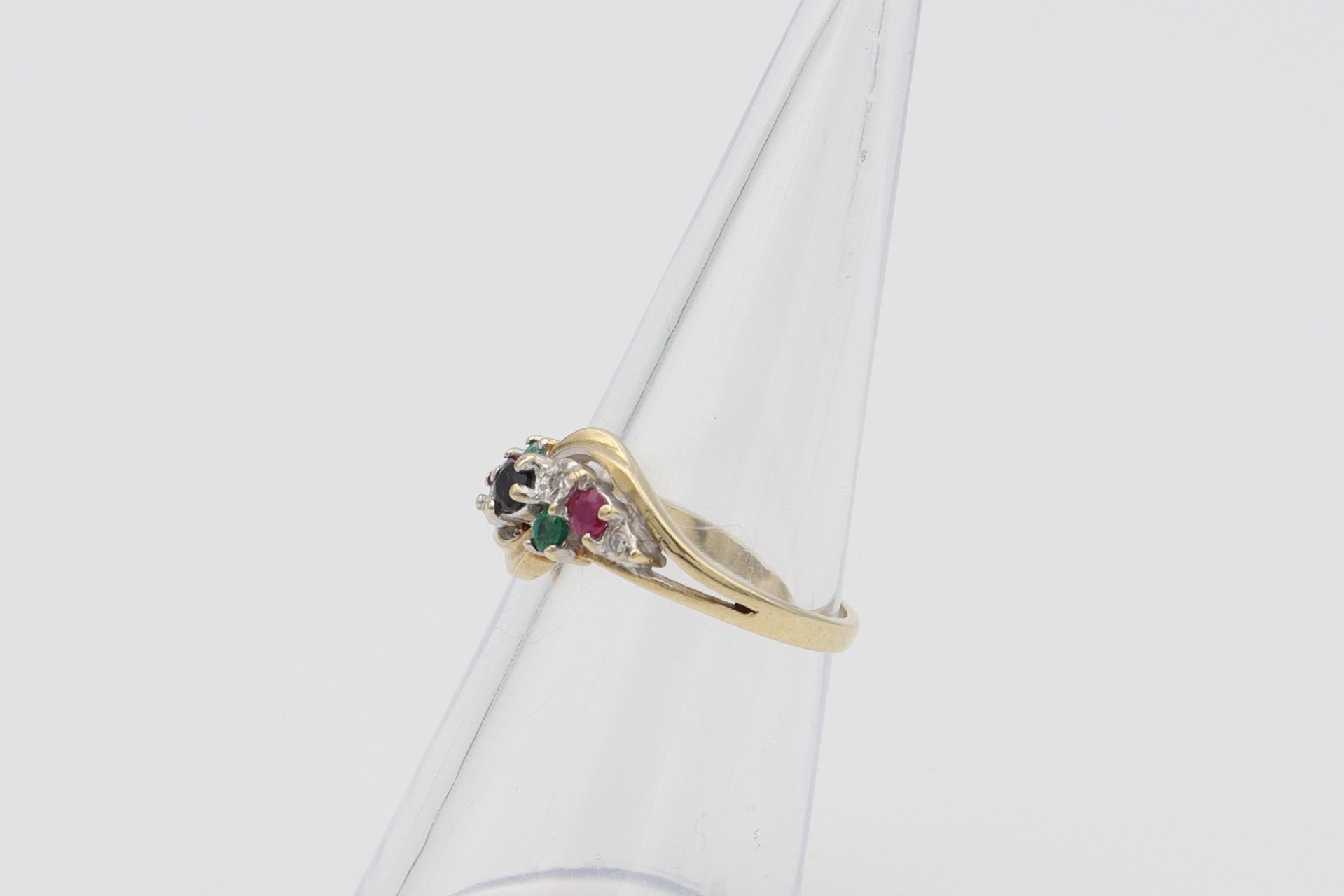 9 Karaat. Ring met robijn, smaragd, saffier en diamant. Maat 17.2. Nr:2020/26.