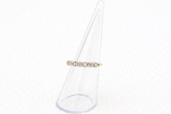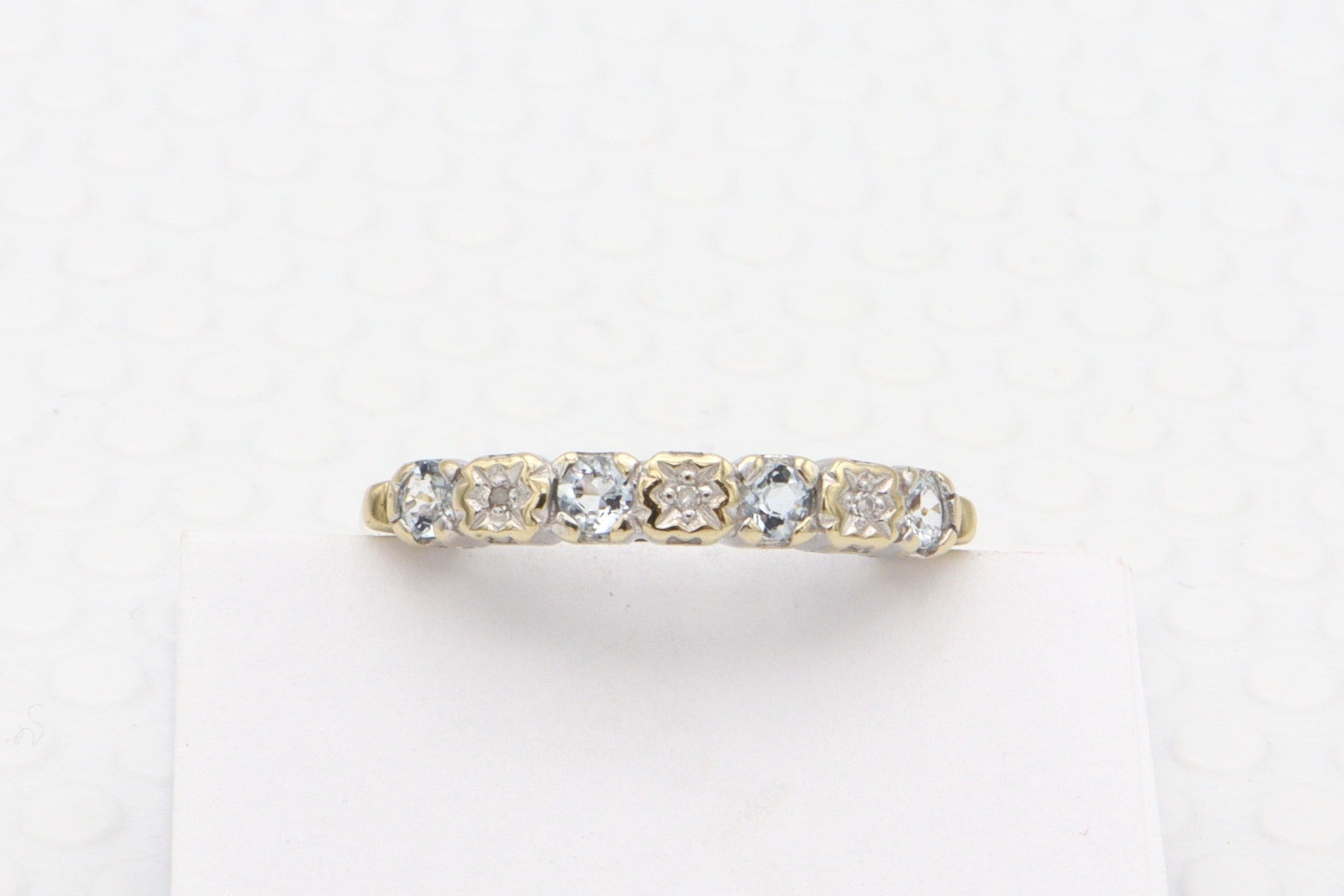 9 Karaat. Vintage ring met 4x aquamarijn en 3x diamant. Maat 16.5. Nr: 2020/237.