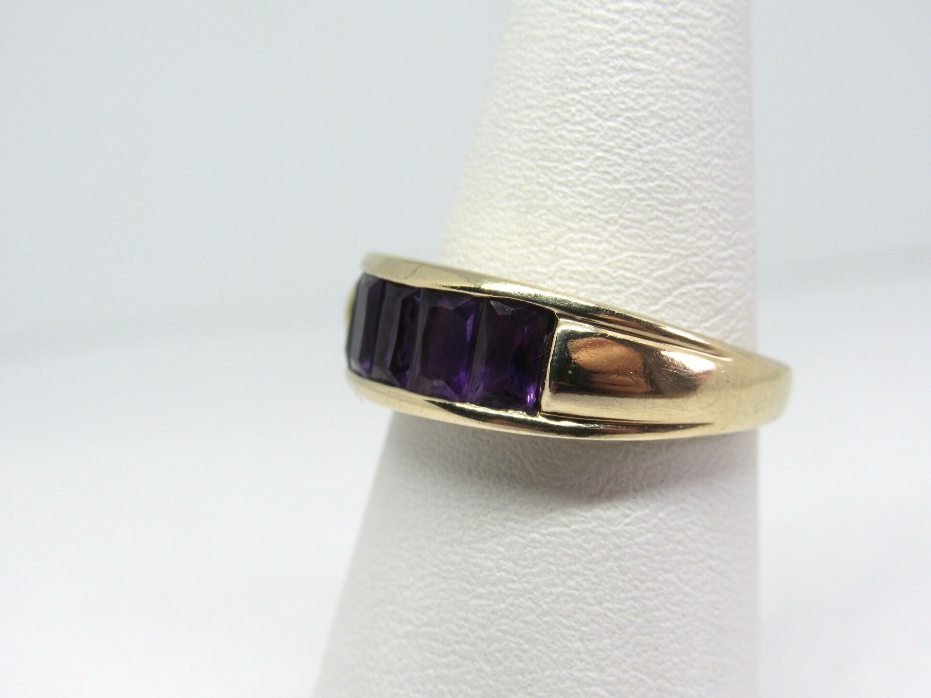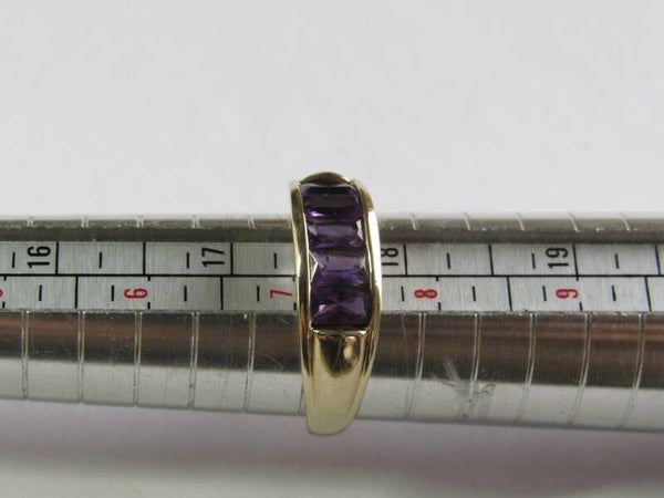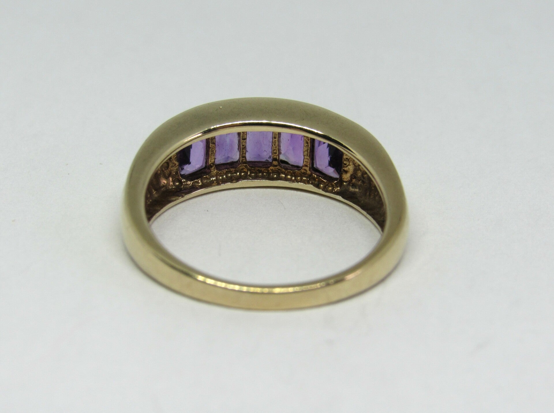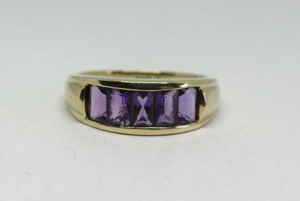 Maat: 17.5.Amethist: 5xKop: 17 mm x 7 mm.Slijpvorm: Emerald.Kleur Goud: Geel.Gemerkt: 375 en een Meesterteken.(b.w.g.g.)Conditie: Uitstekend.