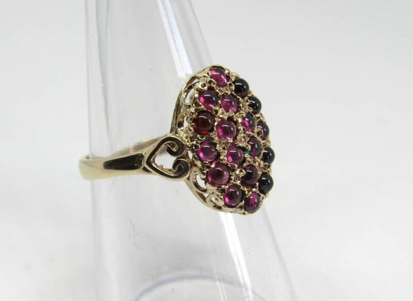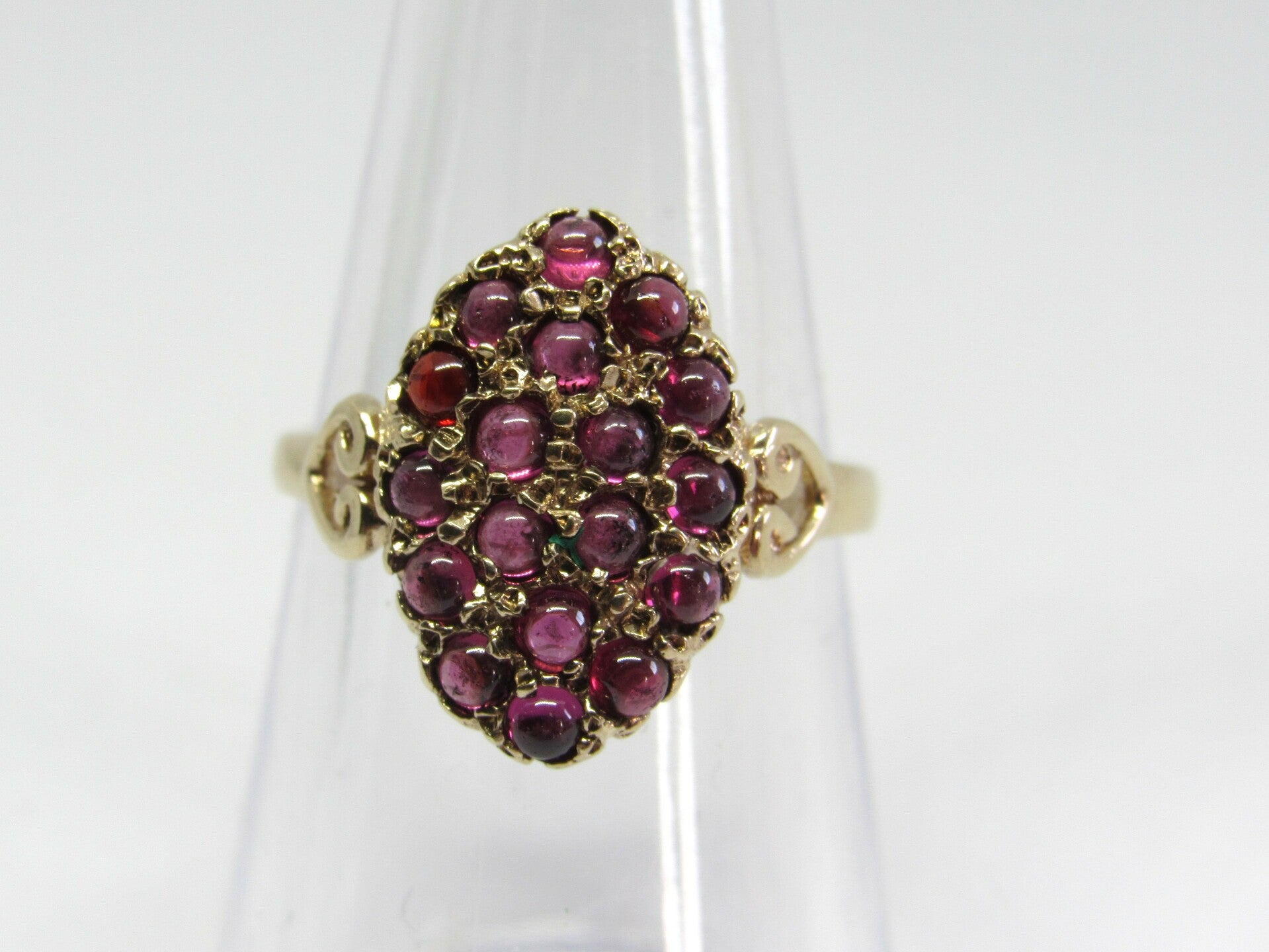 Maat: 17.3.Kop: 17 mm x 15 mm.Granaat: 18xSlijpvorm: CabochonKleur Goud: Geel.Gemerkt : Serie nummer 1139 getoetst 9 karaats.Conditie: Uitstekend.(typefouten voorbehouden)