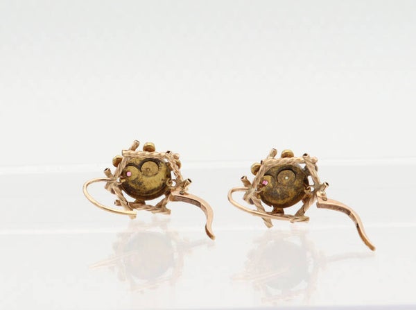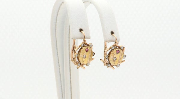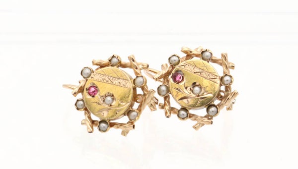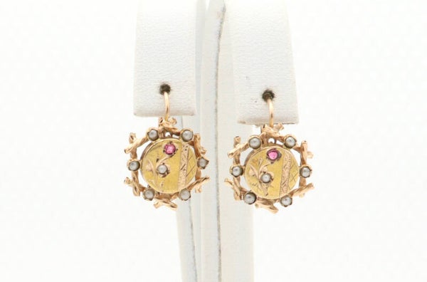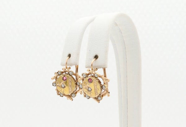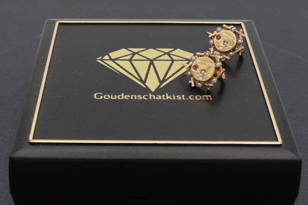 Rosé gouden bi-color antieke oorbellen met zaadparel en robijn. 2021/483.