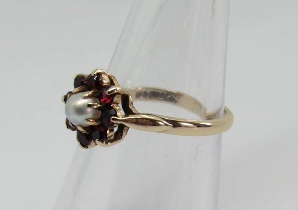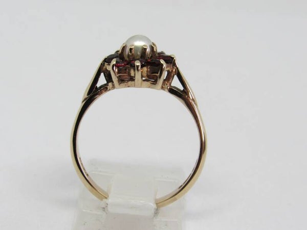 9 Karaat. Ring met parel en 8x granaat. Maat: 17.25. Nr: 19/A122.