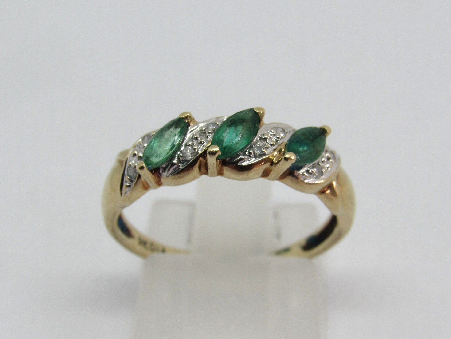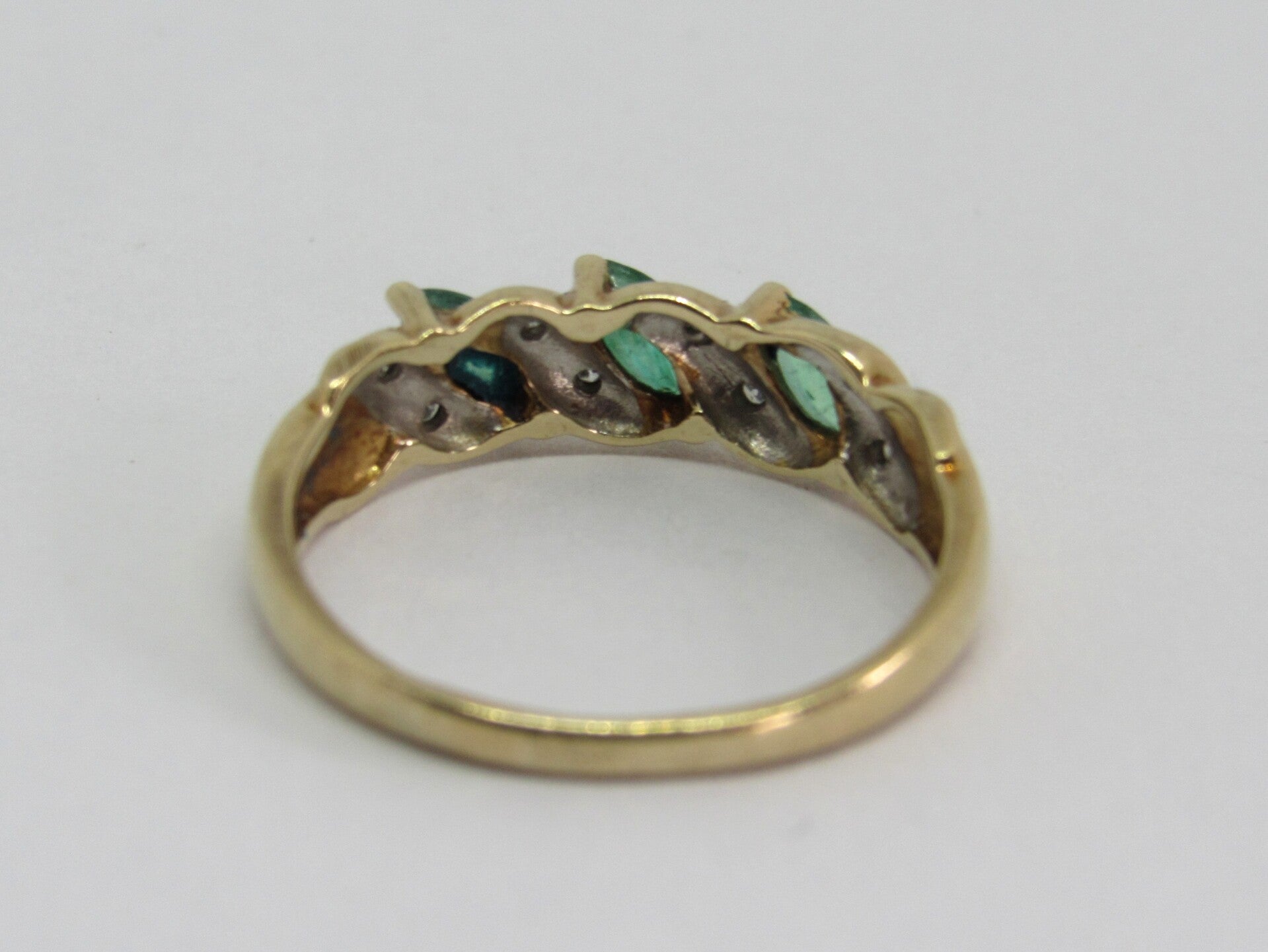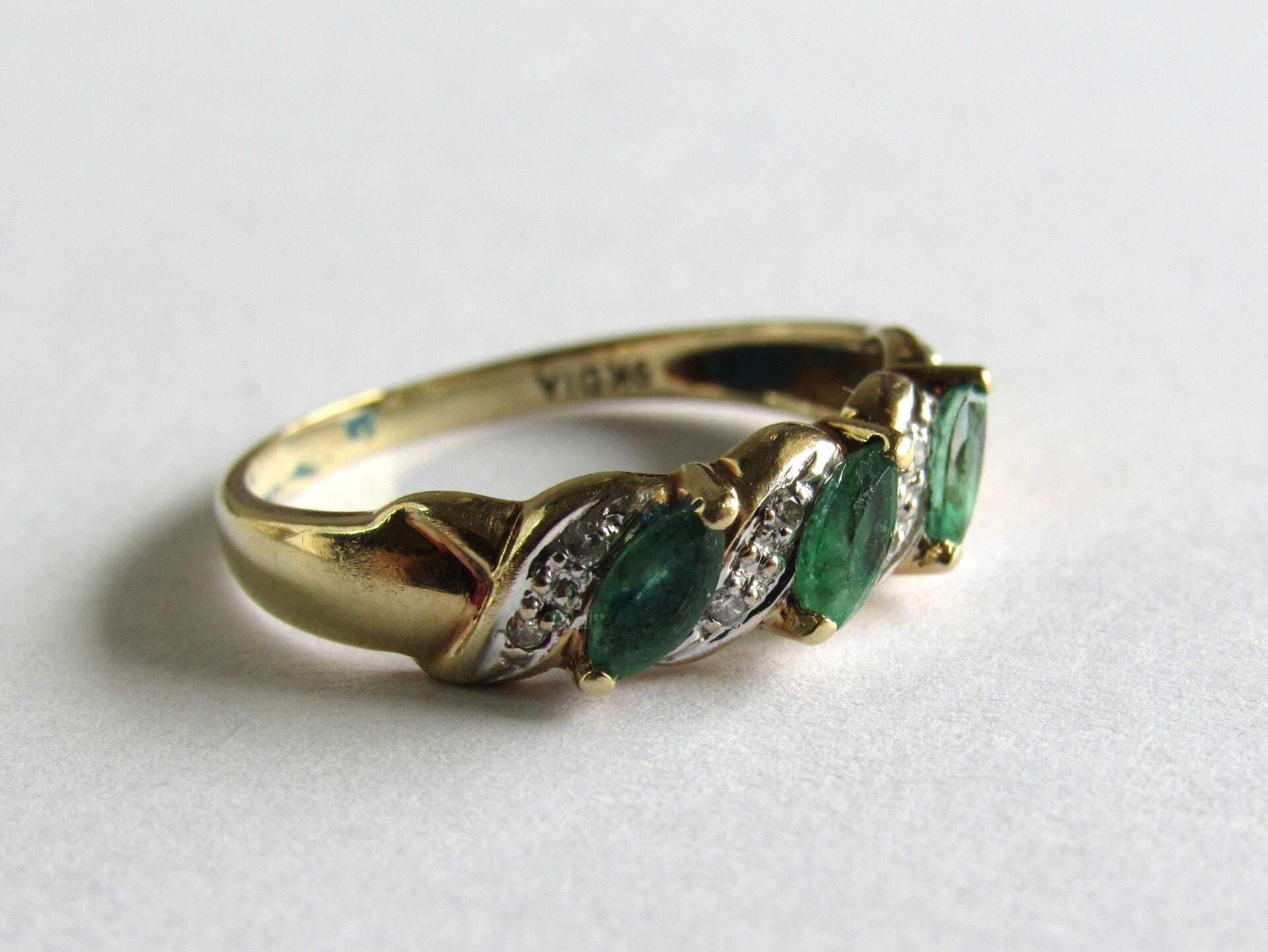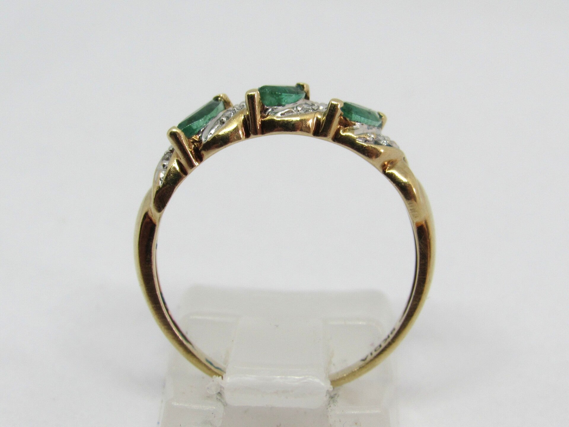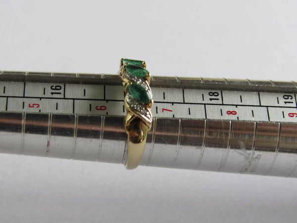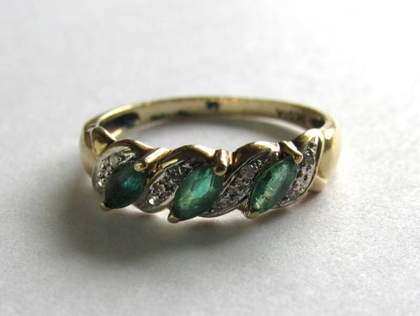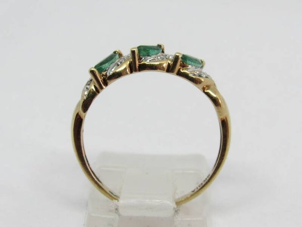 9 Karaat. Ring met 3x smaragd en 8x diamant. Maat: 16.8. Nr: 19/A162.