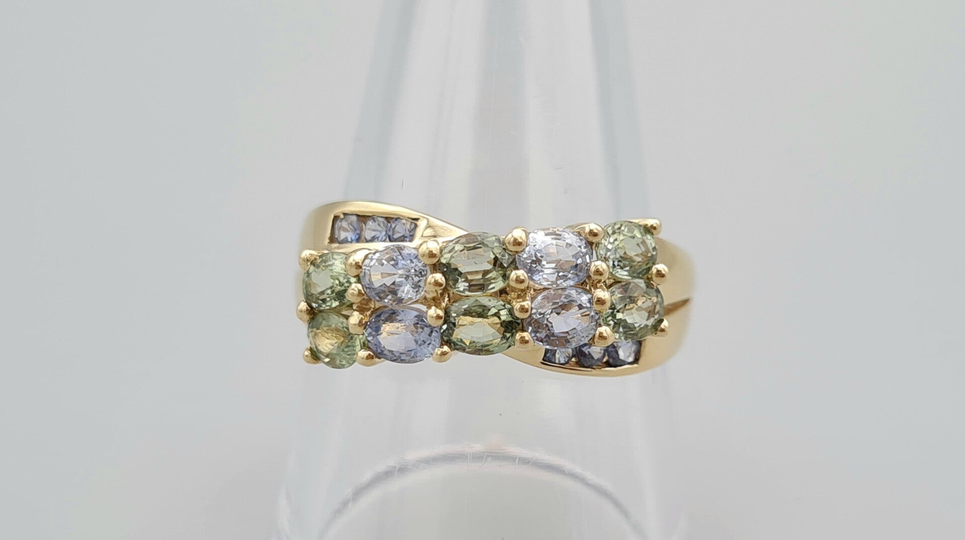 Vintage ring met 3 kleuren saffier. Maat: 19.9. 2022/382.