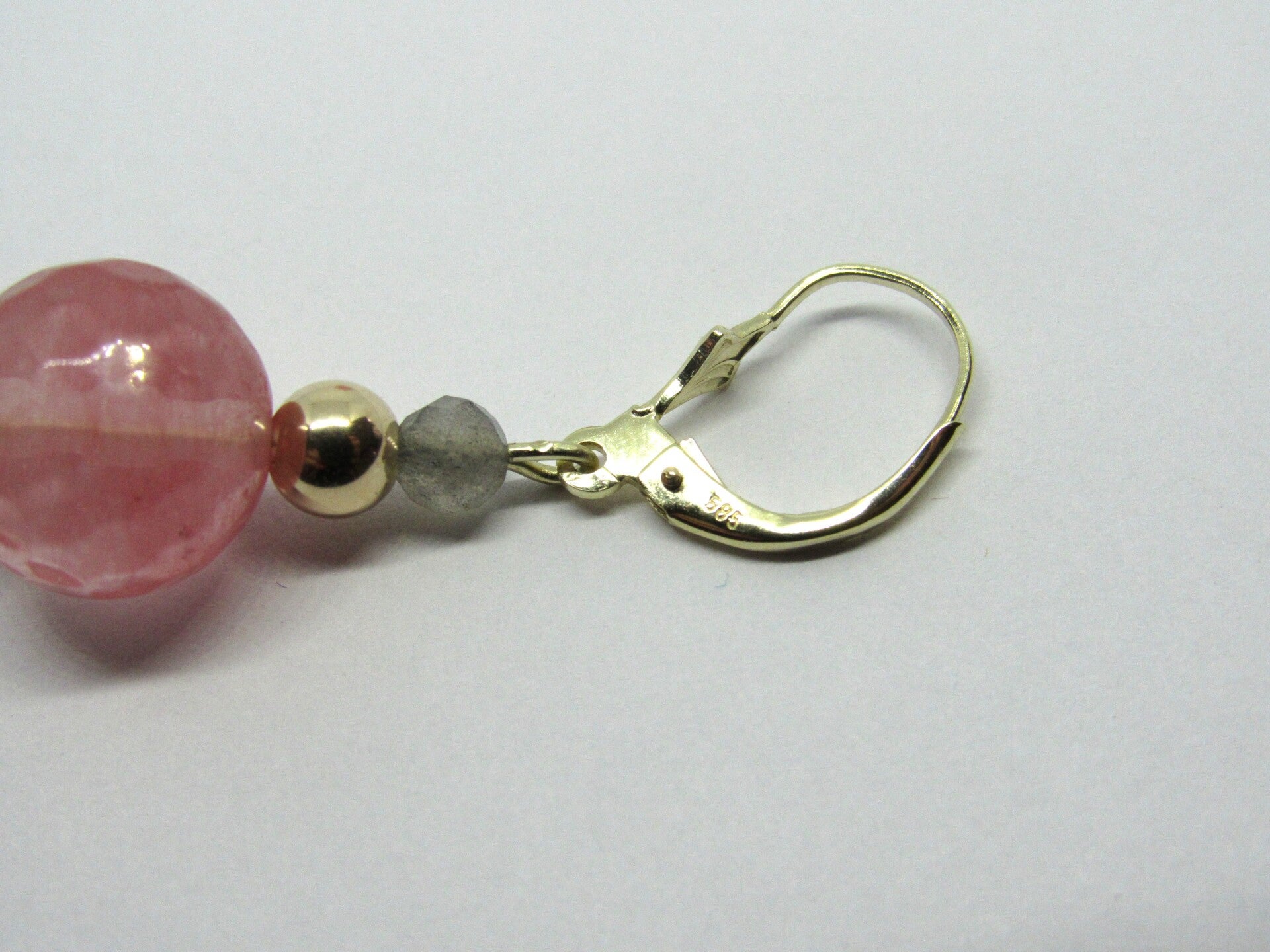 14 Karaat. Oorbellen met watermeloenkwarts, goude en labradoniet. Nr: 19/A262.