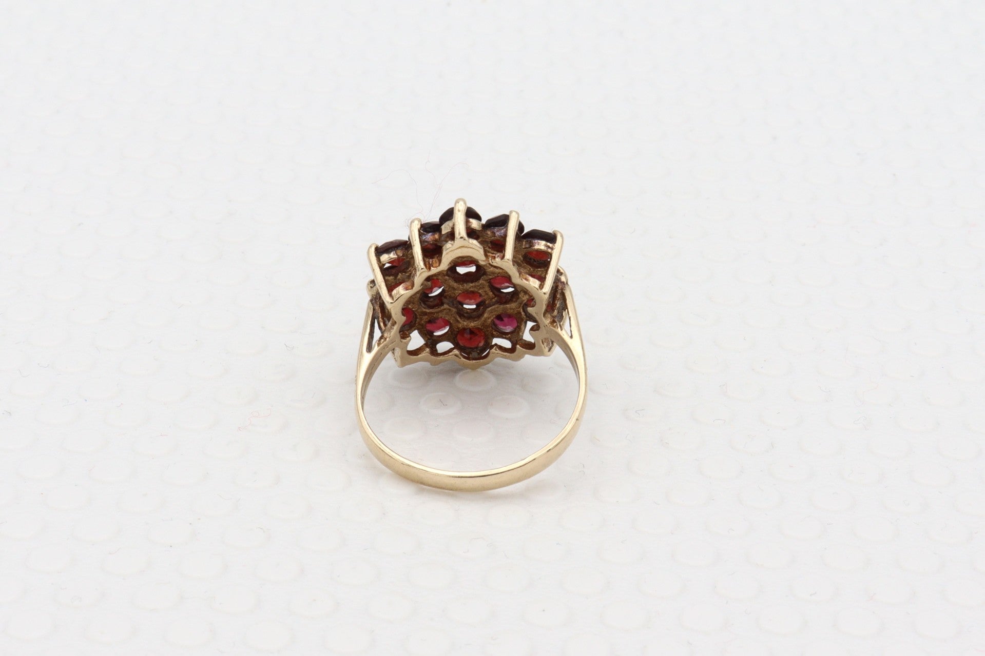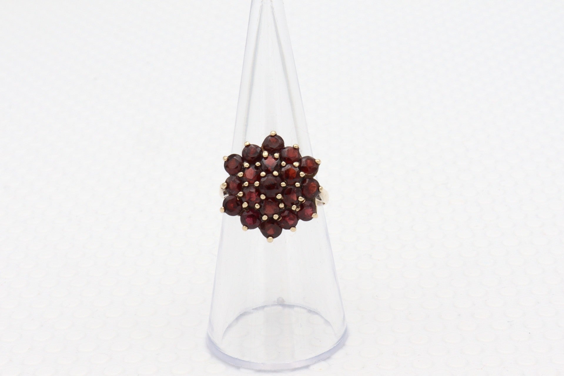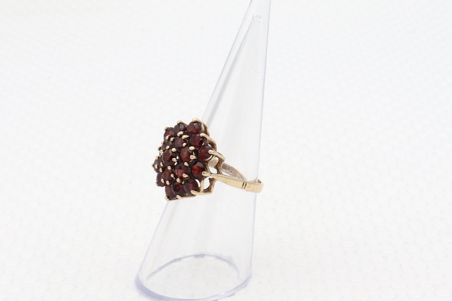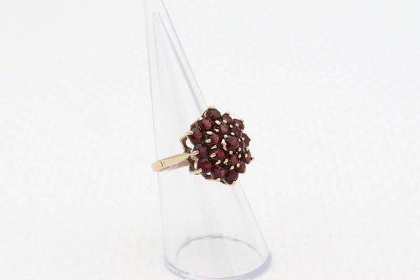 9 Karaat. Vintage cocktailring met 19x granaat. Maat: 19. Nr: 2020/259