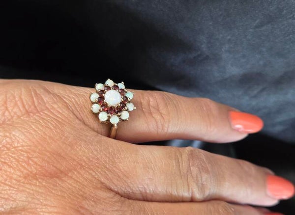 Deze mooie vintage cocktail ring is gemaakt van 9 karaat. De ring is gezet met edelsteen granaat en prachtige edelstenen opaal. De opaal is cabochon geslepen. De edelstenen granaat zijn briljant geslepen.