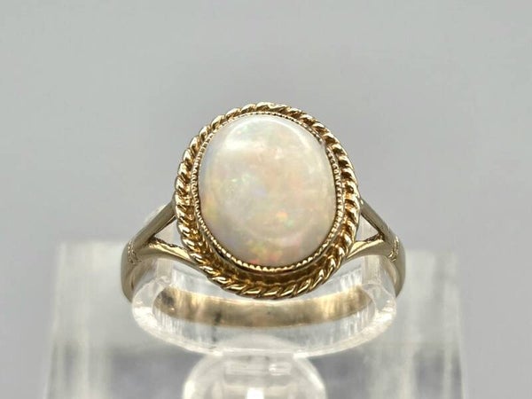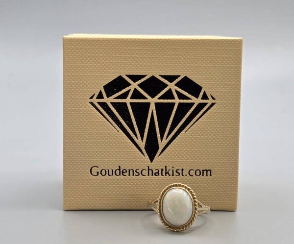 Deze prachtige vintage ring is gemaakt van 9 karaat. De ring is gezet met edelsteen opaal. De opaal is cabochon geslepen.