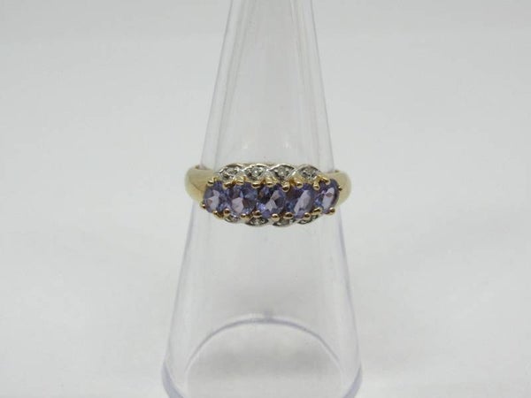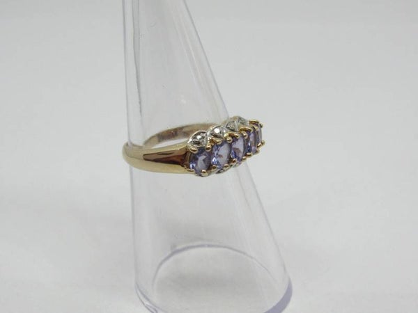 14 Karaat. Ring met 5x tanzaniet en 8x diamant. Maat: 17. Nr: 19/A346.
