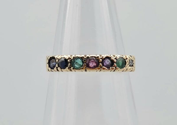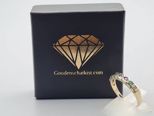 Vintage aanschuif ring met saffier, smargd, robijn, topaas, dia en granaat. 2022/833.
