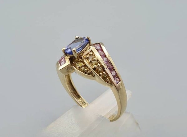 Vintage ring met tanzaniet en roze en gele saffier. Maat: 17. 2022/988.